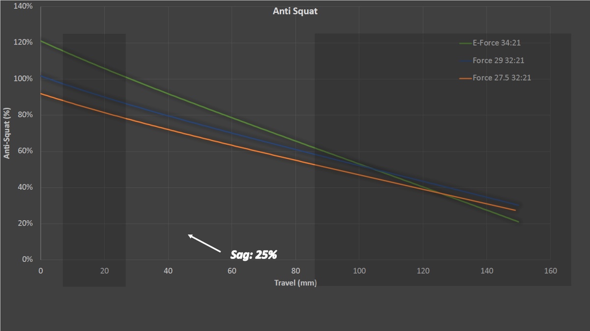 Zde by se dalo upozornit na výraznější sklon horního ramene – osa mezi horními čepy znatelně stoupá. Druhý aspekt, který se důsledně řešil, byl průběh odpružení s tím, že je u obecně těžšího eBiku vhodné „naprogramovat“ zadní stavbu více do progresivního módu, abyste se se svým kolem nedostávali zbytečně často do úzkých. Přidám schválně pár grafů, ať máte představu, jak moc se to v GT řeší!