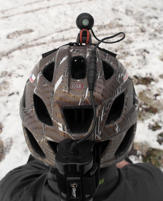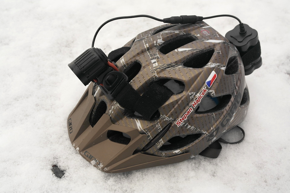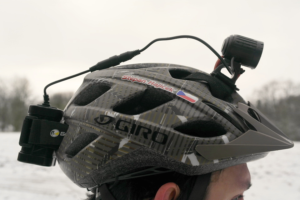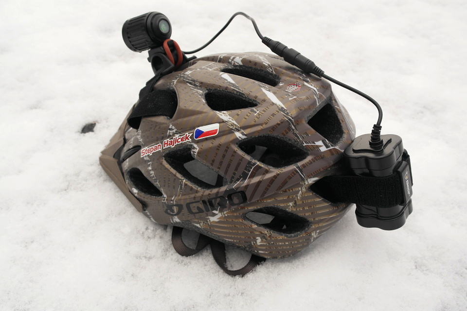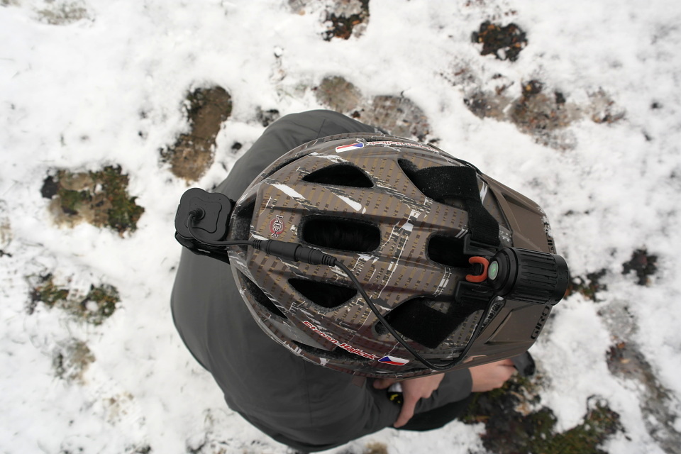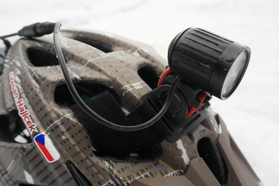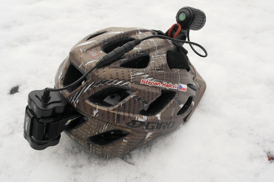 Pojďme ale dál ať se tu neutopíme v teorii a bohapustém áchichich áchichich… Ohledně návodu k použití, jak jsem psal o kousek výše, jsem trochu kecal. Nečetl jsem ho, to skutečně ne, ale musel jsem si alespoň prohlédnout obrázky, jak se světlo i s baterií upevňuje na helmu. Není to až tak složité, jen jsem se potřeboval inspirovat. V zásadě jde o to připevnit plastovou objímku pro samotný reflektor pomocí soustavy suchých zipů na čelní stranu helmy (pozor, ať si nezamotáte prsty) a na zadní stranu chytit pružnou páskou akumulátor. Světýlko se pak jen chytí k objímce pomocí gumového kroužku stejně jako na řídítka. Kdo měl někdy cyclocomputer Sigma, bude jako doma. Pak už jen propojit kablíky, kyblík hodit na hlavu a jedééém!