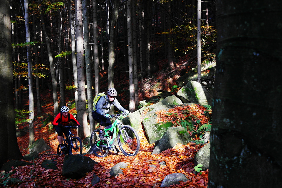 Tajemný je podle nás – na tom jsme se s Kubou shodli – nejlepší z klasických kamenitých trailů v Rychlebech. Sice mě krapet limitovala pouze 100mm vidlice, nijak zásadně jsem ale netrpěl. Alespoň jsem neměl potřebu zrychlovat více, než by bylo na mokrém listí zdrávo. Zejména když bylo nutné mít oči vskutku na stopkách a sledovat bedlivě trail, nebo alespoň jeho stopy náhodně vykukující ze zlatavé peřiny podzimního listí.