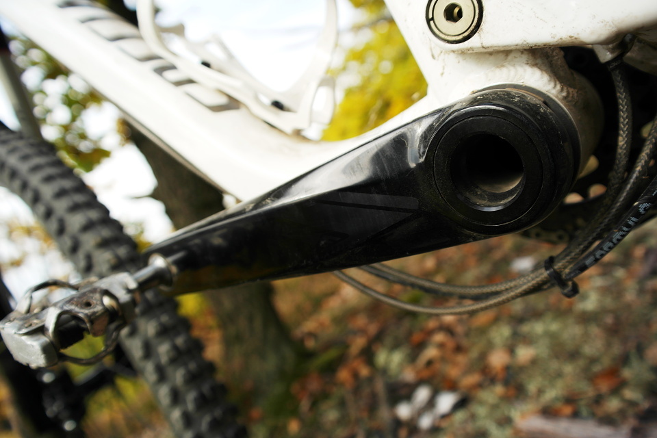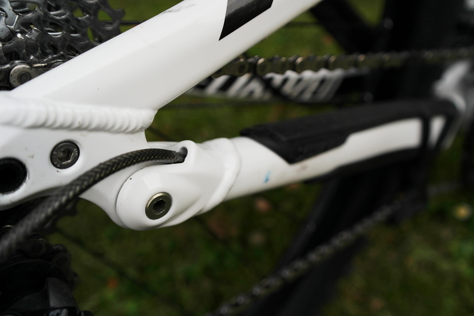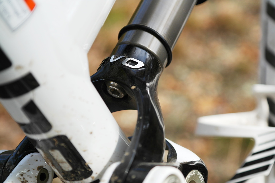 Dalším podstatným prvkem a zásadnější inovací je způsob uchycení tlumiče, konkrétně jeho spodního oka. Tedy oko už tam vlastně ani není! Zato je k pístnici přímo uchycena vidlička, která obchází sedlovou trubku, aby se za ní spojila s horním ramenem a zároveň i vzpěrami zadní stavby. Děje se tak prostřednictvím tzv. koncentrického čepu. Více lidsky řečeno – jde o dva samostatné čepy na jedné ose. Lépe asi bude, když se podíváte na fotky nebo na video funkce zadní stavby, kde je krásné vidět, „jak se to celé hýbe“.