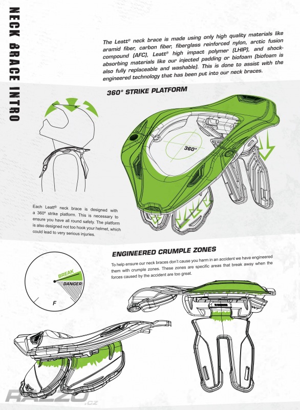 Leatt Brace je, jak již bylo řečeno, chránič krční páteře. Jde o to, aby si biker či motorkář nepoškodil při pádu krční páteř tím, že se mu hlava vyvrátí do nepřirozené pozice. Princip funkce je zcela prostý. Při pádu se totiž helma (samozřejmě že integrální, s kokoskou nemá smysl si Leatta oblékat) opře o lem chrániče a nepustí hlavu do nepřirozených pozic. Nutností je samozřejmě to, aby Leatt i helma byly správně usazeny a upevněny, jinak to fungovat nebude! Názorně vše demonstrují následující obrázky.