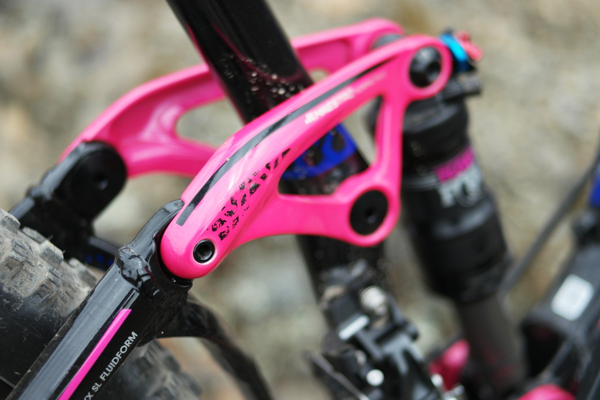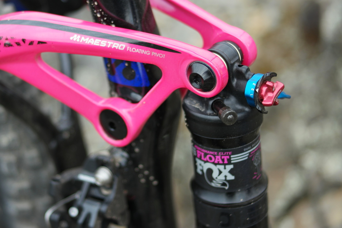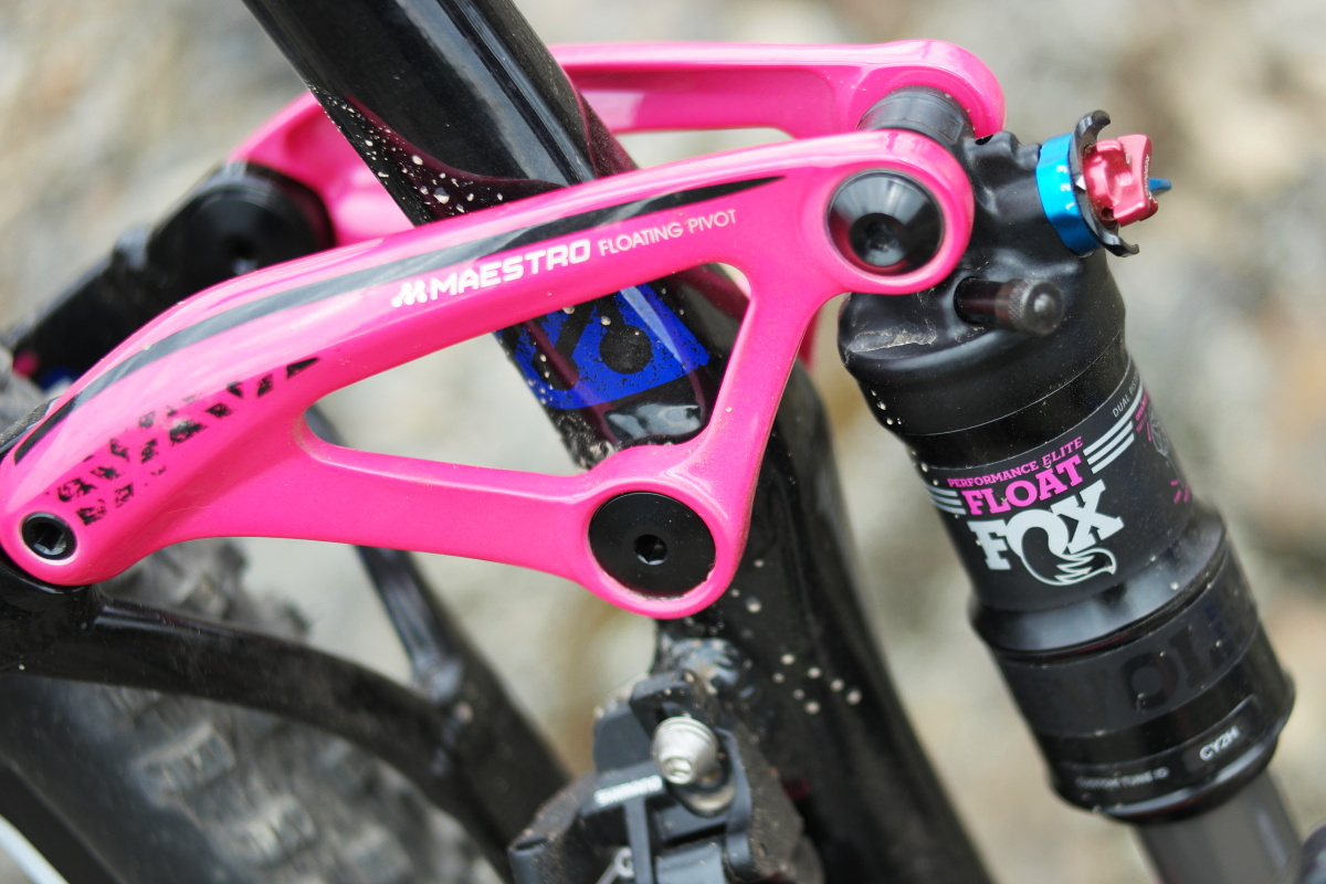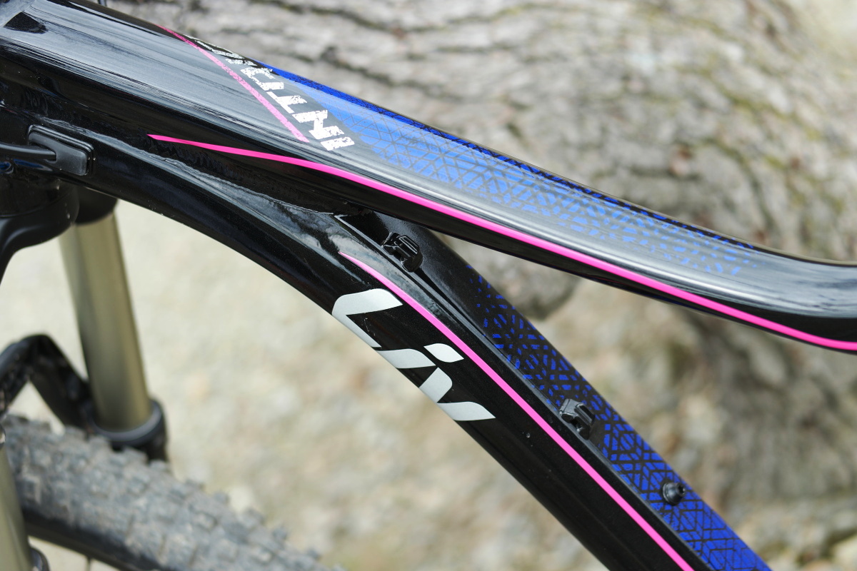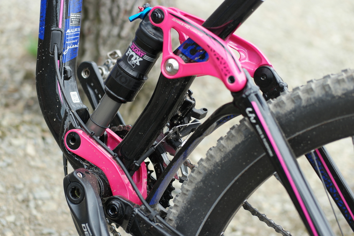 V zadní části nacházíme klasické řešení značek Liv a Giant, zavěšení pojmenované Maestro. Jedná se o řešení s pevným trojúhelníkem zadní stavby, který je s hlavní částí rámu spojen dvěma kratšími vahadly, která jsou zde nápadně růžová. Specialitou Maestra poslední generace jsou kazetová kuličková ložiska umístěná v místě uchycení horního oka tlumiče, aby se zadní stavba pohybovala ještě snáze a její krok byl co možná nejhladší.