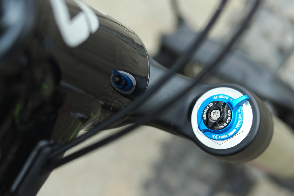 Podobné, i když trochu jiné je to u vidlice. I zde jsou k dispozici tři základní režimy Open, Medium a Firm (velká modrá páčka). Navíc u Intrique 1 najdete i malé černé kolečko, kterým se ladí citlivost v plně otevřením módu. Zde bych začal klidně tím, že bych tento prvek naplno otevřel a jen v případě potřeby přepínal režimy Medium nebo Firm. Vidlice Fox Float 34 se sice snaží, není ale nejcitlivější na světě. Každopádně pokud by vám přišla zbytečně aktivní, lze ji jemně zkrotit právě oním černým kolečkem.