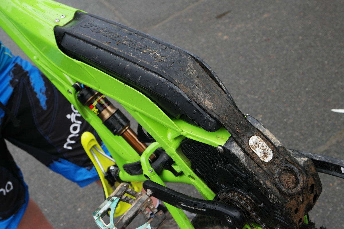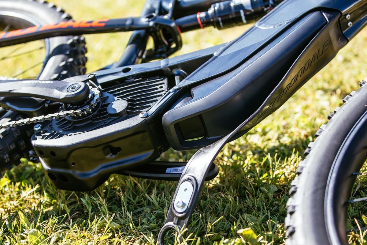 Už se pomalu blížíme do finále základní prezentace. Nejnižší možné polohy těžiště se dosáhlo již zmíněným specifickým umístěním akumulátoru. Zároveň takto vznikl i prostor pro plnohodnotnou láhev a košík a dalších pár vychytávek. Tedy již zmiňovaný gumový ochranný pás BatStrap pod baterií, či velký plechový protektor pod motorem. Zadní stavba jako taková je již celkem známou kreací ze současných strojů Cannondale, modelově Habit nebo Scalpel-Si. Jedná se o „prostý“ jednočep s přepákováním na tlumič (osa u zadní osy kola je nad patkou na vzpěrách, nikoliv pod ní na vidlici).