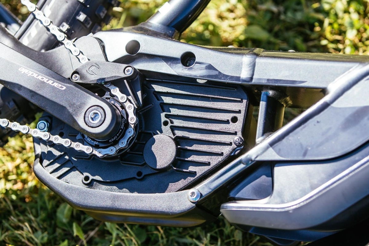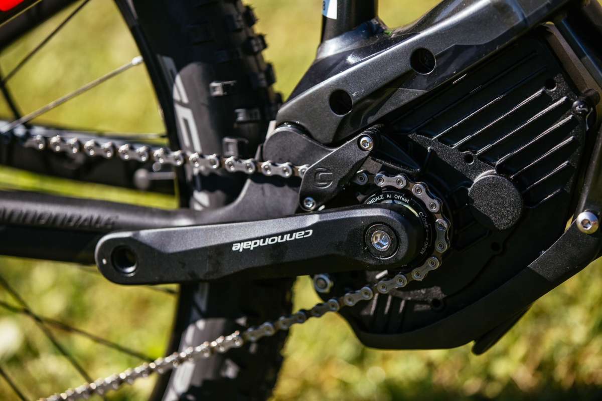 Dále se řešilo, jak co nejvíce zkrátit zadní stavbu a došlo se k názoru, že je potřeba použít Boost, nebo spíš (staro)nový Super Boost Plus standard. Jednoduše se použil zadní náboj dříve čistého DH standardu (šířka 157 mm) a bylo hotovo. Tedy vlastně nebylo. Lidé z Cannondale, aby zachovali rozumnou řetězovou linku, si ještě sami navrhli a vyrobili upravený převodník, který není plochý jako výchozí díl Bosch, ale o 6 mm odsazený směrem ven. Na běžných klikách je údajně místa dost, proto stačilo takto posunout celou řetězovou linku a hned se dala zkracovat zadní stavba a rozšiřovat uchycení hlavního čepu zadní stavby.
