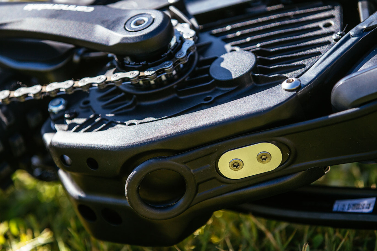 Díky tomu všemu bylo možné i optimálním způsobem umístit hlavní čep zadní stavby, což je v případě systému s jediným převodníkem teoreticky poměrně jednoduché, přesto v praxi často vídáme všemožné záludné kreace, občas i s pomocnou kladkou, které jsou důsledkem výše zmíněných velkých rozměrů originální zástavby motoru Bosch. Navíc zde zbylo místečko i pro stylové vodítko a zapomenuto nebylo ani na poctivé oplastování zadní vidlice, aby nikde nic nedrčelo.