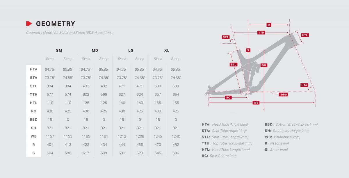 Geometrie nového Slayeru se částečně inspirovala jeho předchůdcem, proto zde dominuje zejména extra položená vidlice. Respektive geometrii jako takovou bude možné ladit pomocí systému Ride-4™, systém použitý na DH mašině Maiden, což je vlastně jednodušší varianta systému Ride-9™ (Altitude, Element atd.). Řešení Ride-4 (spodní oko tlumiče je uchyceno ve čtyřbokém kameni) umožní ladit geometrii ve čtyřech krocích, aniž by to mělo vliv na vyznění funkce zadní stavby.