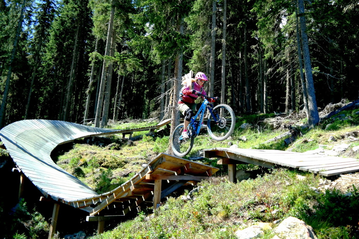 Ve třetině Teäre Trailu se můžete dát doleva na černý Zaahe Trail. Tento je charakteristický řadou umělých překážek, které byly ale hodně hravé. Šlo o různé skoky s regulerním gapem, ale byly vždy postavené tak, abyste je dali i poslepu. To jsem ocenila hlavně já. Pořád nejsem žádný skokan a tady se mi líbilo, že jsem mohla skákat úplně všechno, aniž by se mi u toho klepala kolena strachem.