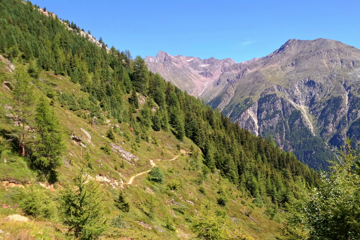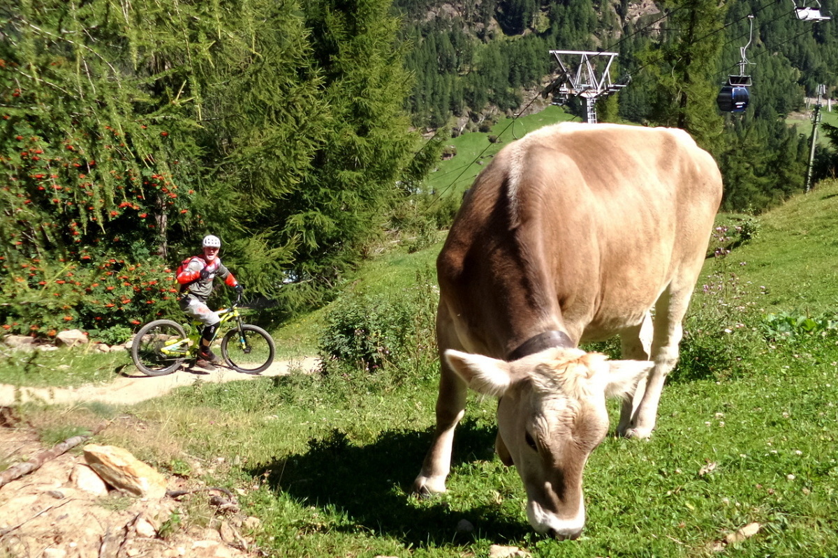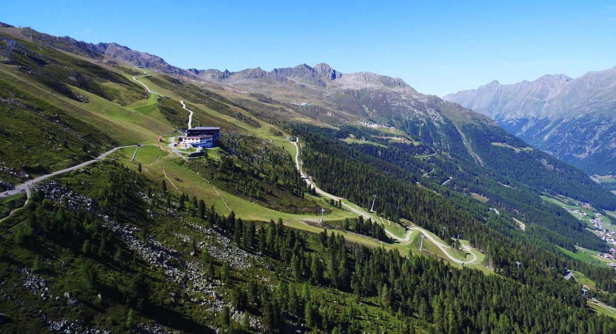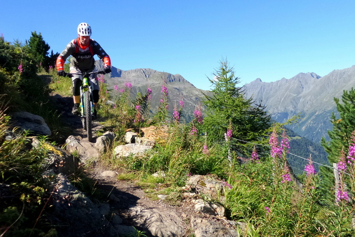 Od výstupu kabinky pak kupříkladu sjeďte první úsek Täere Trailu a pak přejděte na cedulku Schölder Trail a tady pojedete chvíli po úzké pěšině po vrstevnici, místy i mírně do kopce. Tento trail vás dovede na asfaltovou cestu vedoucí na ledovec Rettenbach, kde se vám naskytne výhled na zasněženou sjezdovku Světového poháru. Zajímavý pohled uprostřed léta!