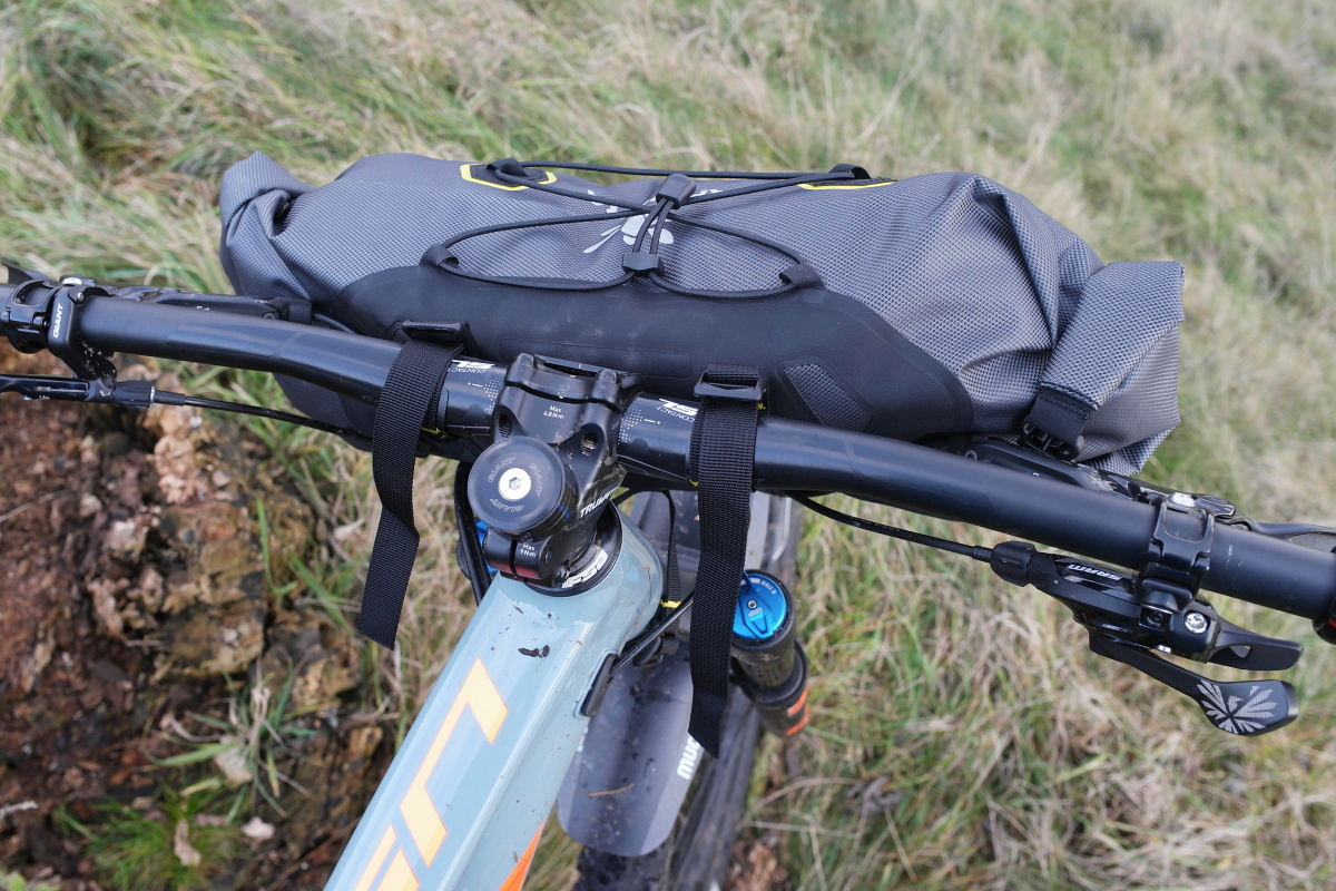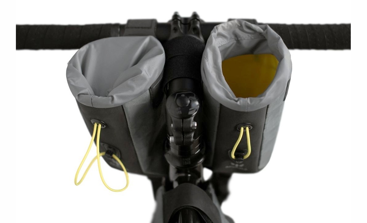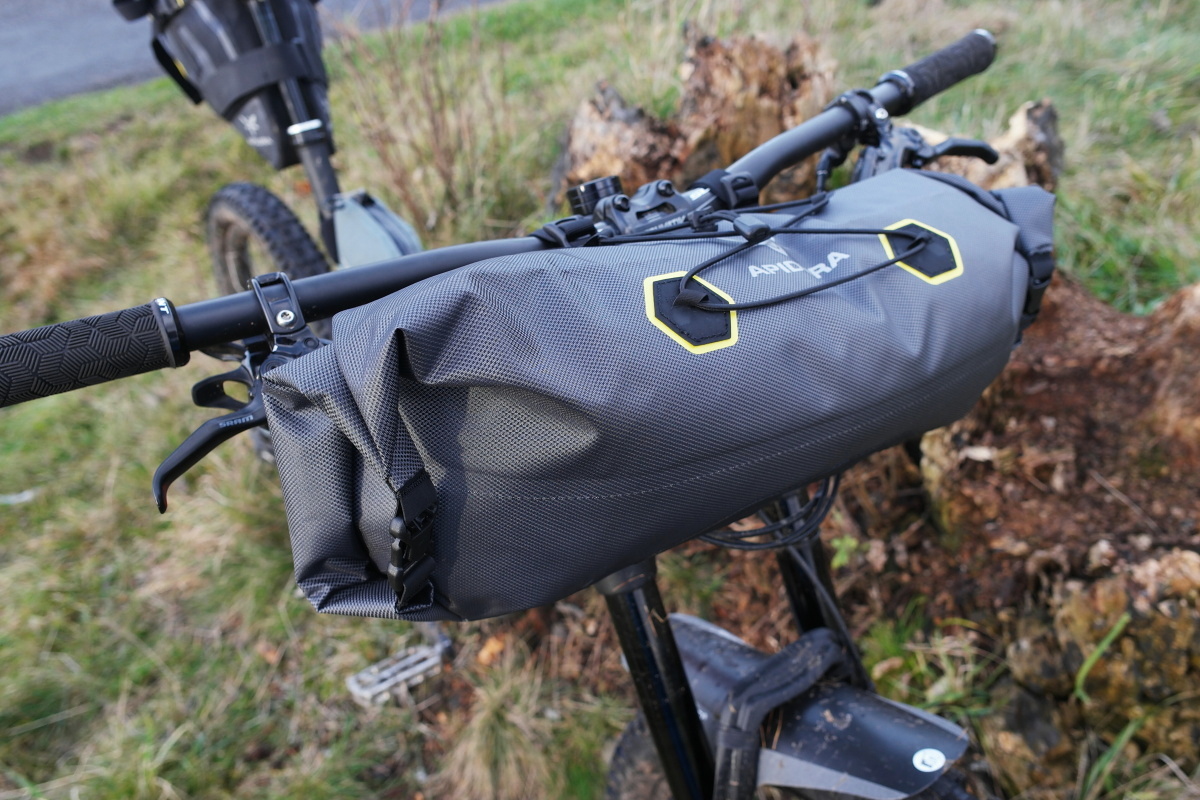 Začněme logicky odpředu, kde jsem na řídítka zavěsil brašnu označenou jako Handlebar Pack Dry (9L). V nabídce je ještě větší varianta s objemem 14 litrů, extra brašna pro všemožné příslušenství Accessory Pack (také jako odolnější verze Dry), která se jednoduše nacvakne na základní brašnu, nebo dvě verze s lehce slabší voděodolnou úpravou – Handlebar Pack Regular a Compact.