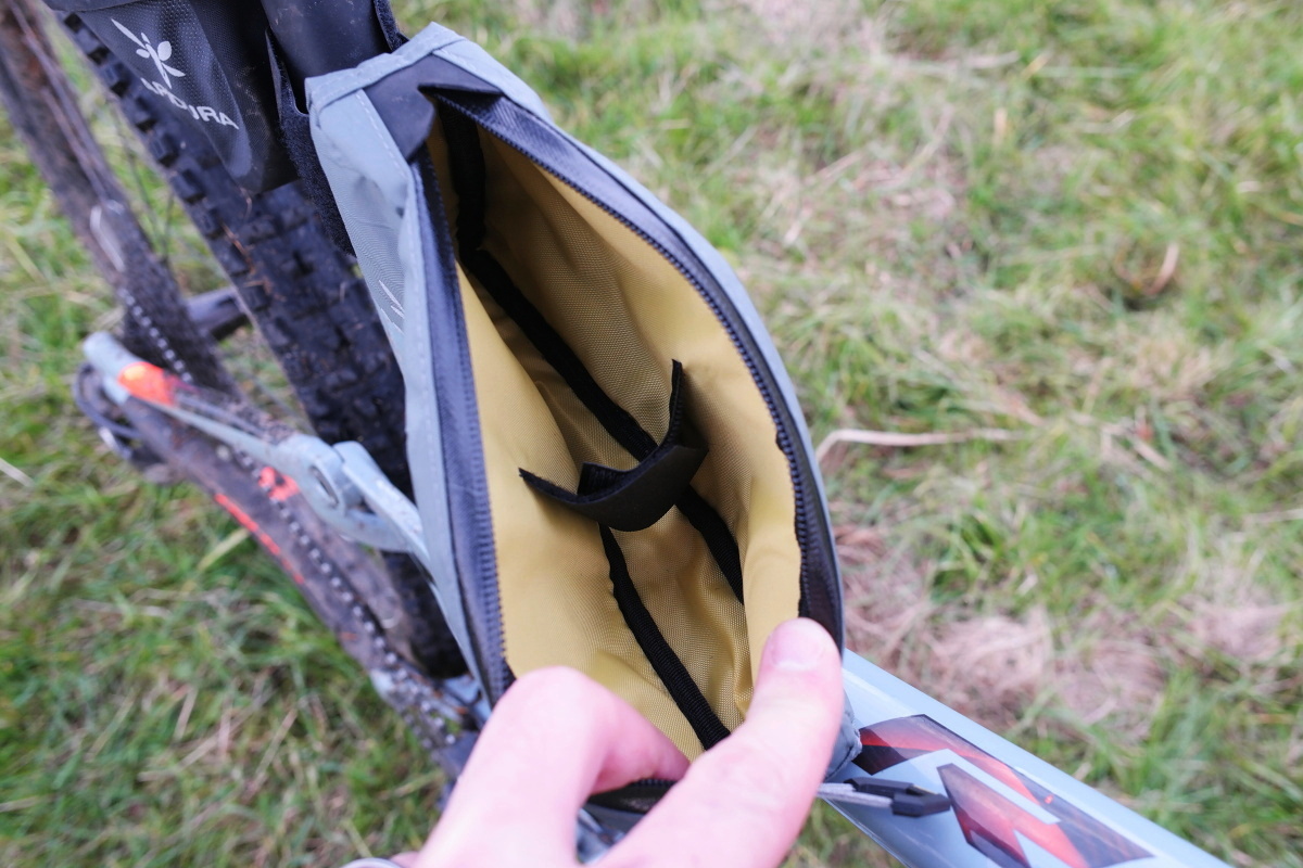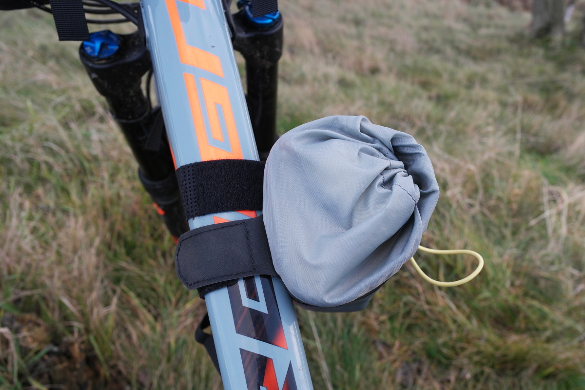 Na Giantu Reign jsem ale neměl dost místa, musel bych přidat asi ještě o dost víc podložek pod představcem, vyřešil jsem to ale k téměř plné spokojenosti umístěním této kapsy na konec horní trubky a jejím zajištěním okolo sedlovky. Trochu jsem zde narazil na zlom rámové trubky a na přítomnost rychloupínáku na sedlovce, vše se ale podařilo vyřešit.