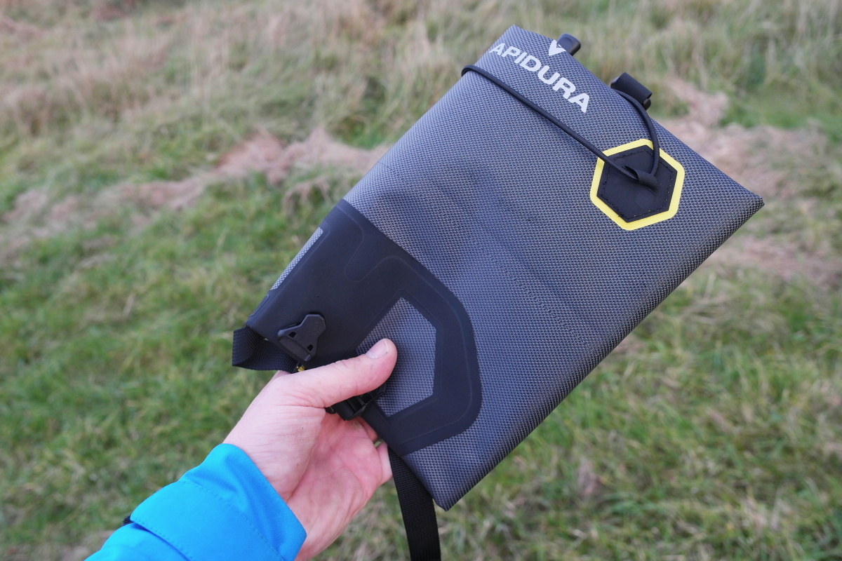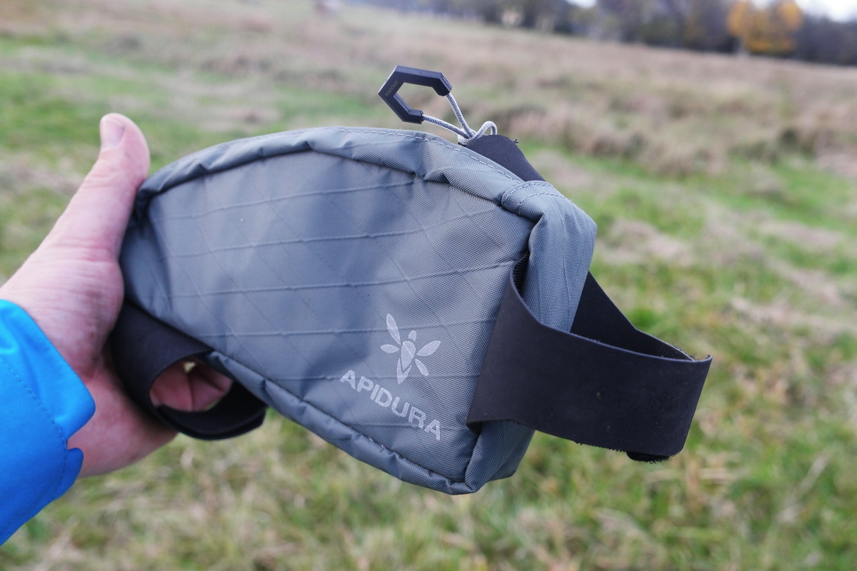 Poslední malý doplněk značky Apidura, jenž jsem měl k dispozici, je tzv. Food Pack Extended. Je to taková drobná kapsička, která se upevní na řídítka, zajistí se okolo představce a pak se ještě utáhne páskem kolem hlavové trubky. V principu se jedná o jednoduchý odkládací prostor, kam lze uložit věci, jež chcete mít po ruce. Jídlo, pití, telefon či nářadí.