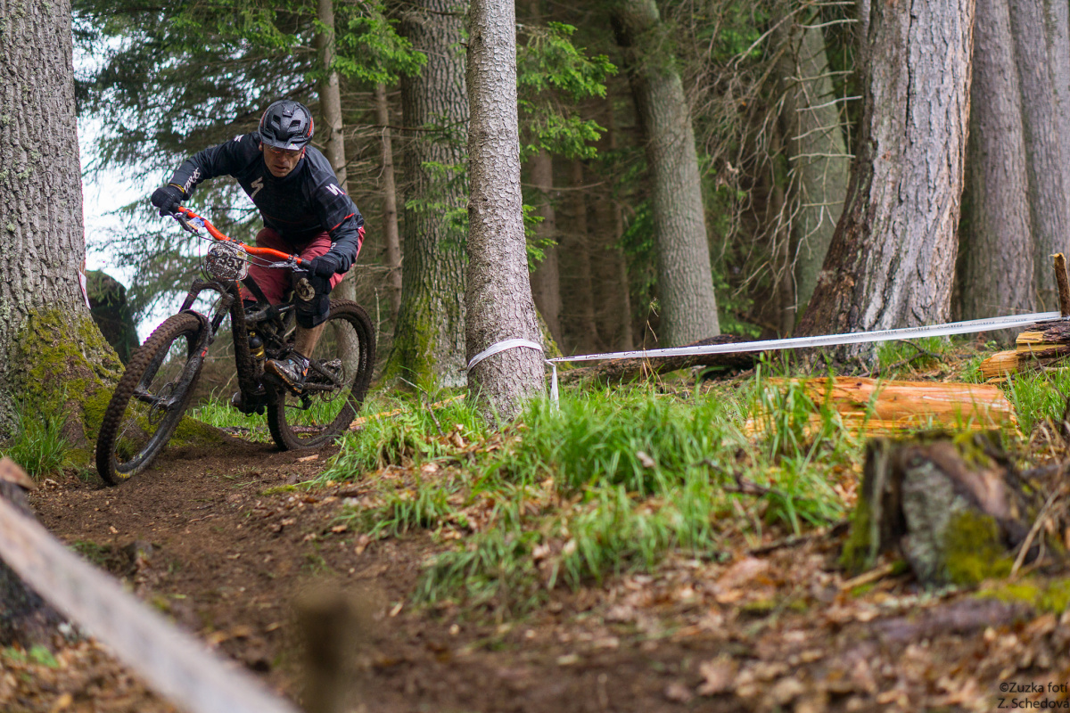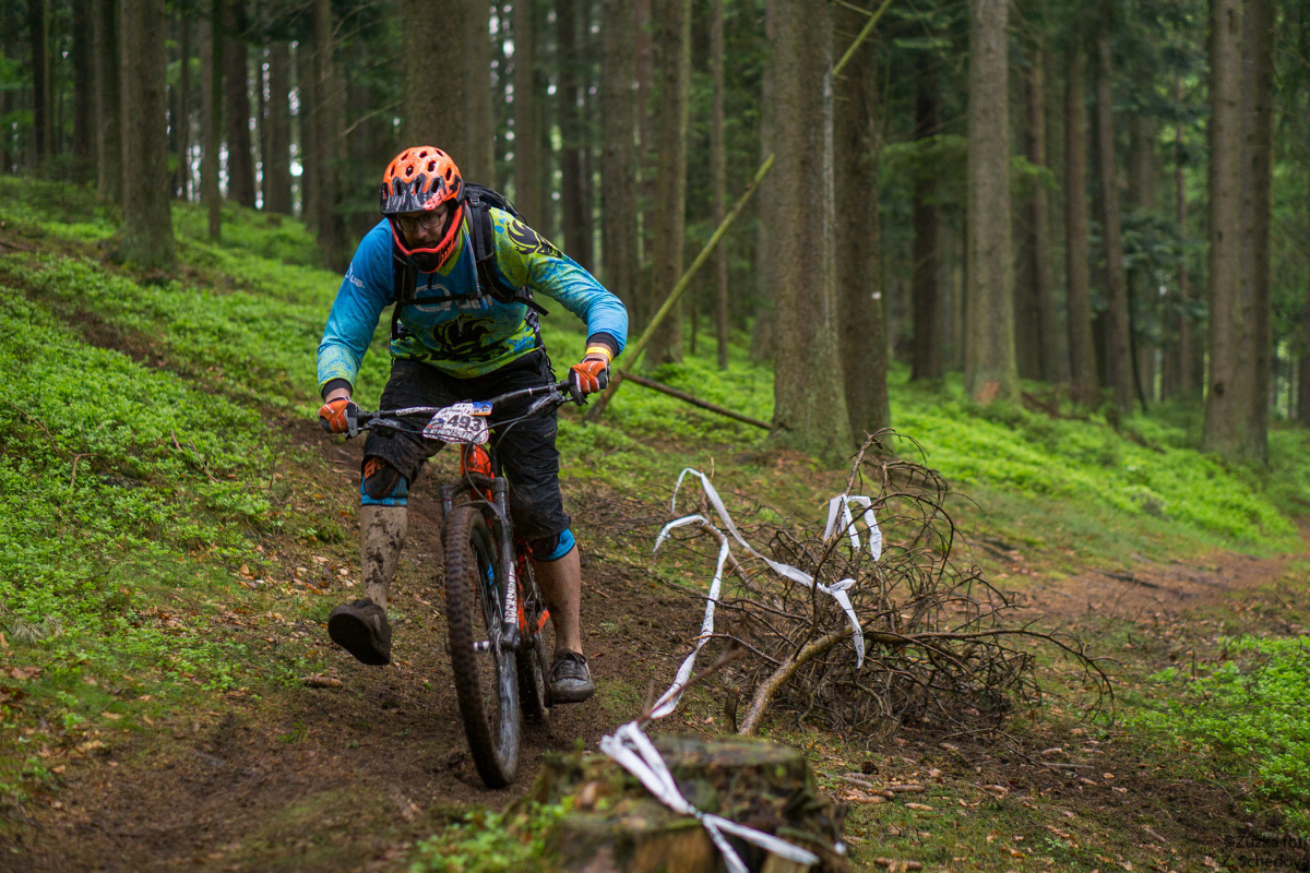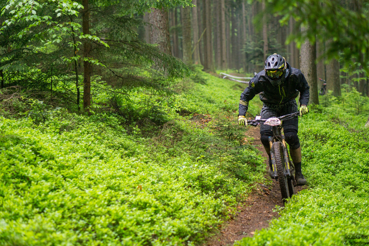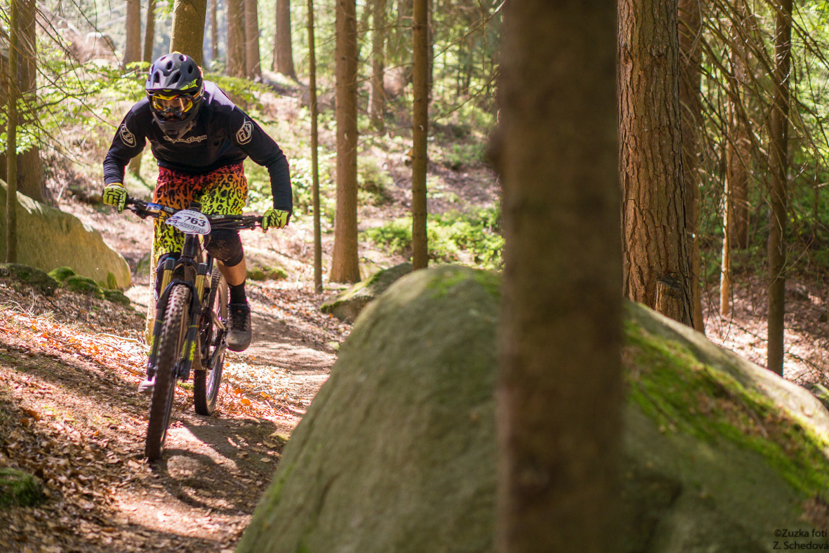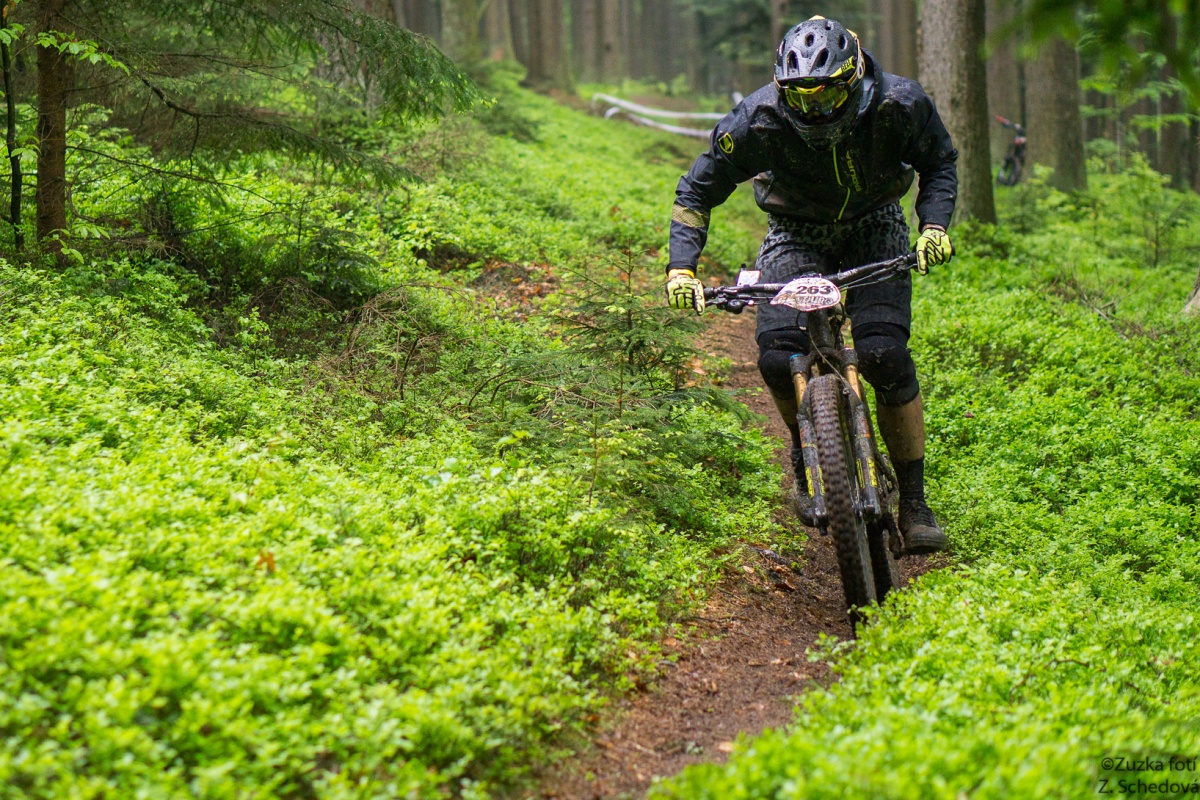Duchna se ještě před startem naopak díky své (ne)schopnosti rozeznat časoměrku Terku Votavovou od důchodkyně z nového video spotu od Specialized stará všem okolo a patřičnou dávku zábavy. Následně raději rychle prchá z místa činu po RZ pryč. Já jdu do akce pár jezdců po něm. První část trati je rovinatá, šlapavá a natažená po části místního Flowtrailu. Po přibližně půl kilometru trať lipenský Flowtrail opouští a přechází do své střední části tvořené převážně slalomem vymlíkovaným v prudším svahu, kde začíná ta pravá mokrá zábava.