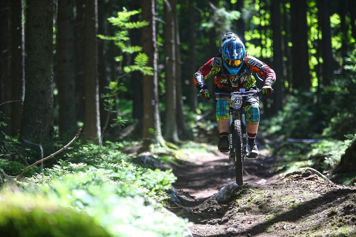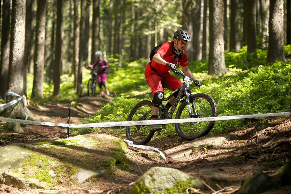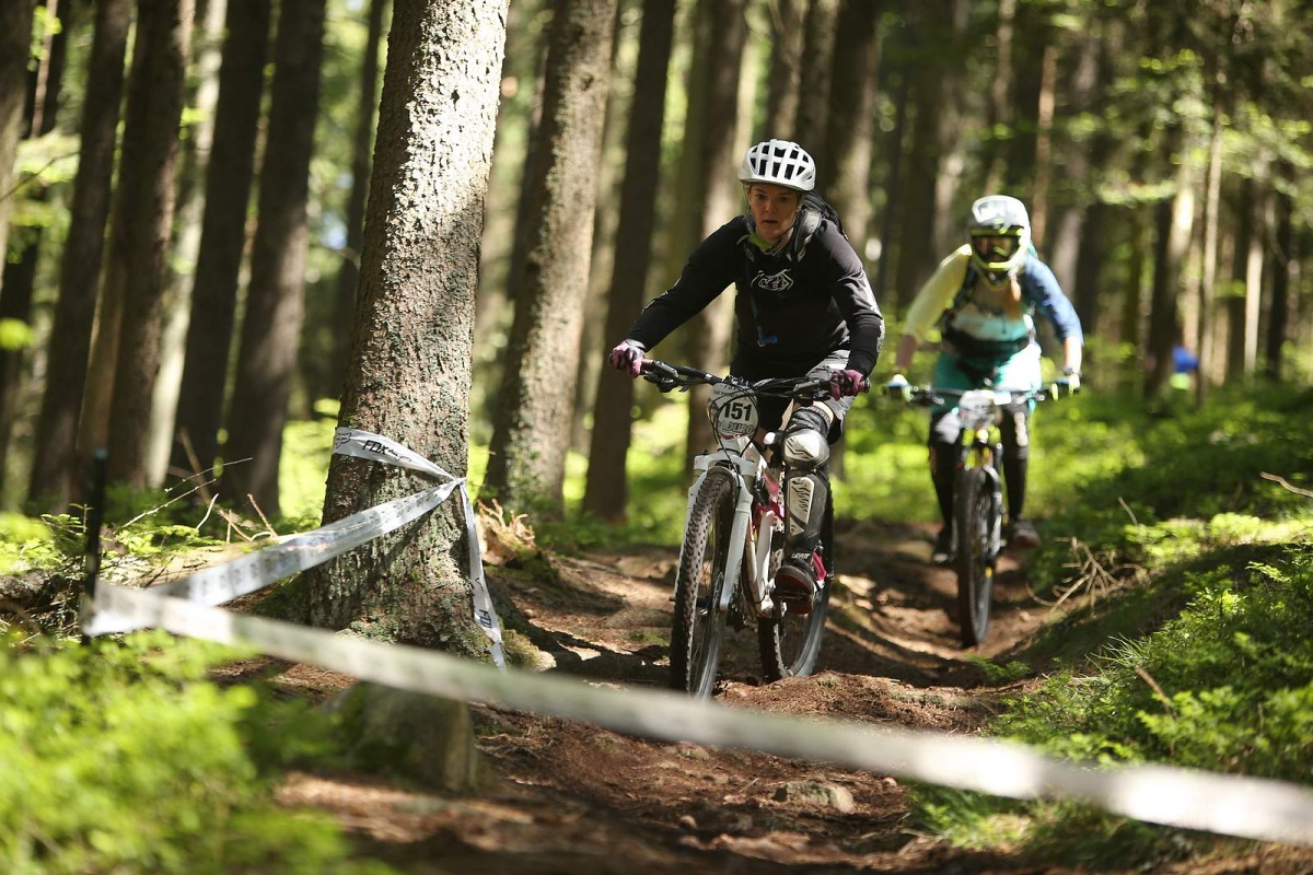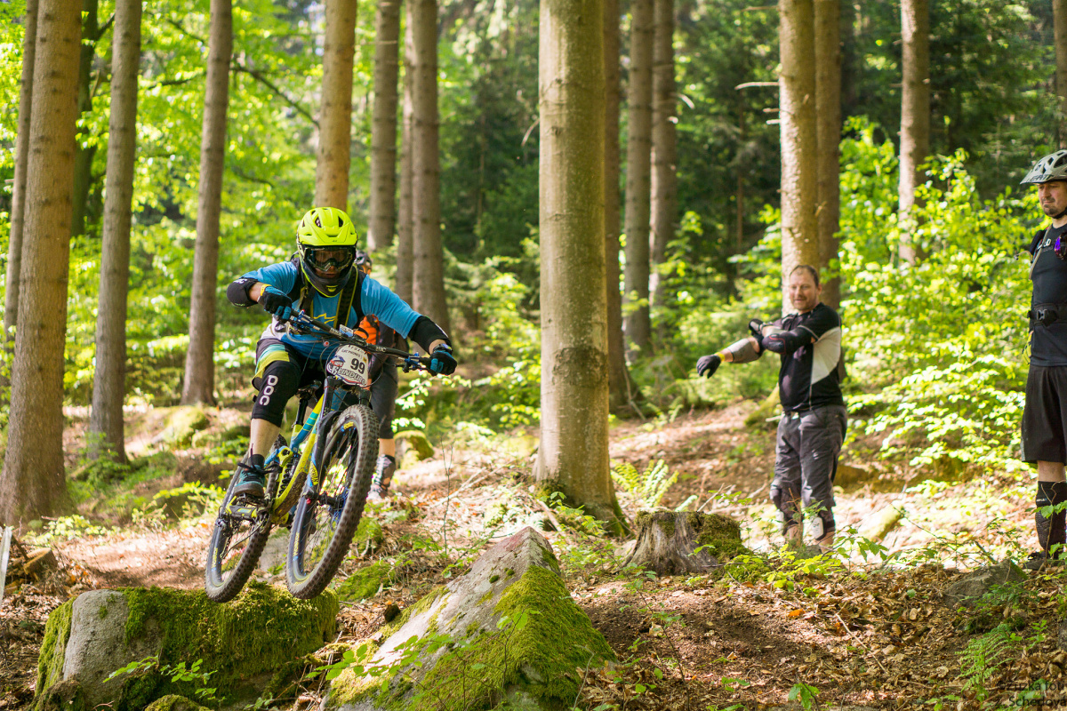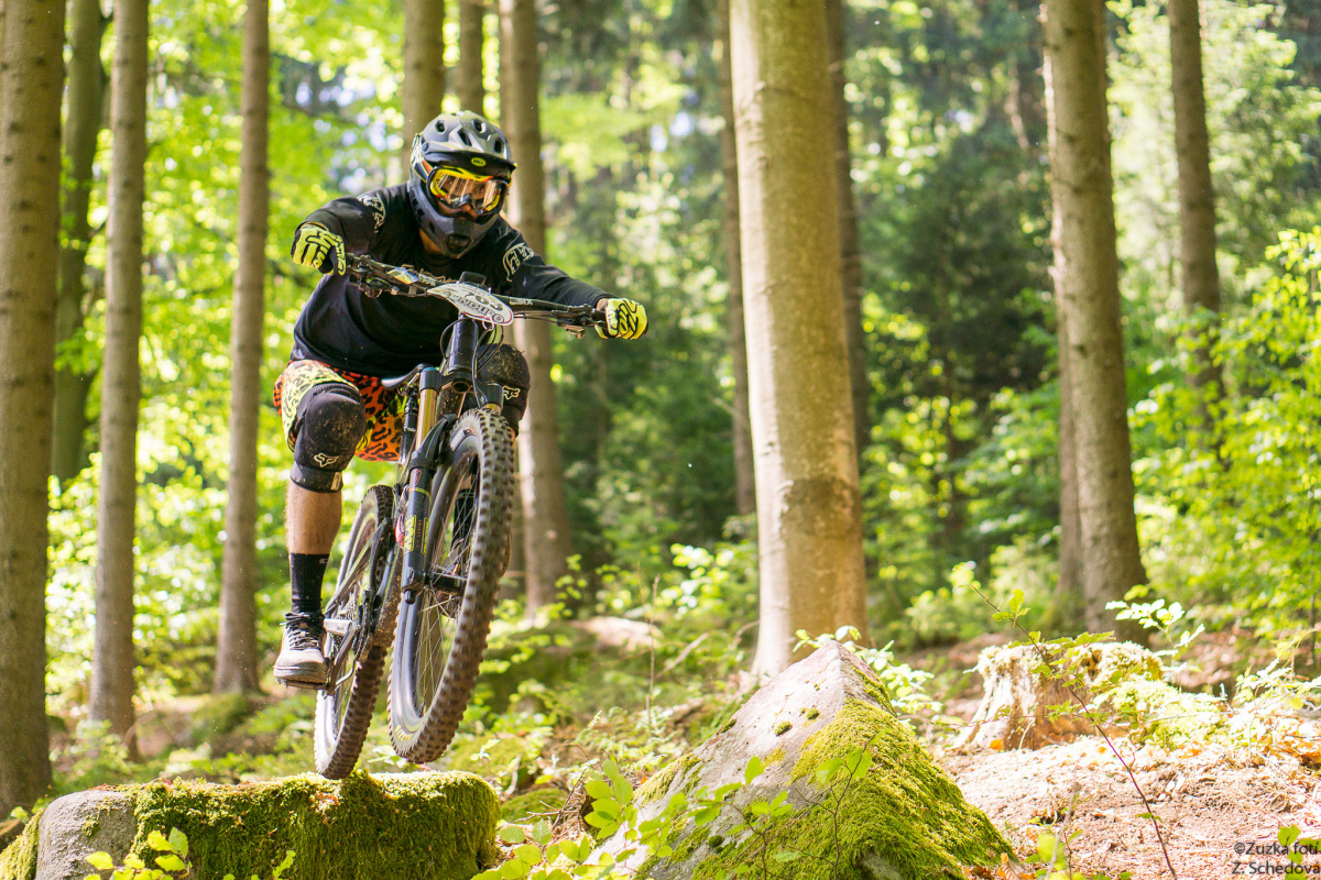 Duchna se ještě před startem naopak díky své (ne)schopnosti rozeznat časoměrku Terku Votavovou od důchodkyně z nového video spotu od Specialized stará všem okolo a patřičnou dávku zábavy. Následně raději rychle prchá z místa činu po RZ pryč. Já jdu do akce pár jezdců po něm. První část trati je rovinatá, šlapavá a natažená po části místního Flowtrailu. Po přibližně půl kilometru trať lipenský Flowtrail opouští a přechází do své střední části tvořené převážně slalomem vymlíkovaným v prudším svahu, kde začíná ta pravá mokrá zábava.