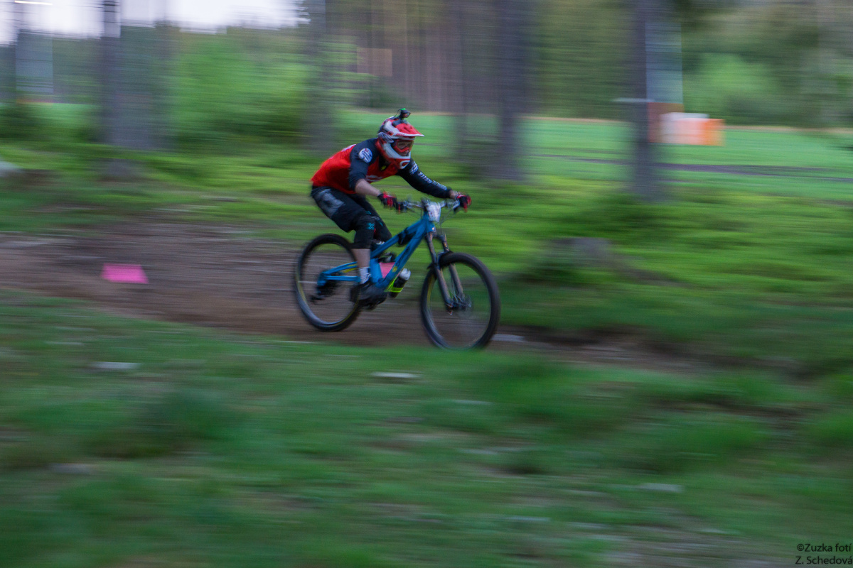 Sice to udržím odšlápnutím bez výletu mimo bicykl, ale než se z dolíčku mezi dvěma kmeny vyhrabu zpátky na trať, uběhne spousta cenných vteřinek. Zbytek lesní části už je bez jakýchkoliv zákeřností. Po opuštění lesa a přejezdu pár odkloněných zatáček na otevřené louce se následně dostávám do zmíněného parkového dojezdu.