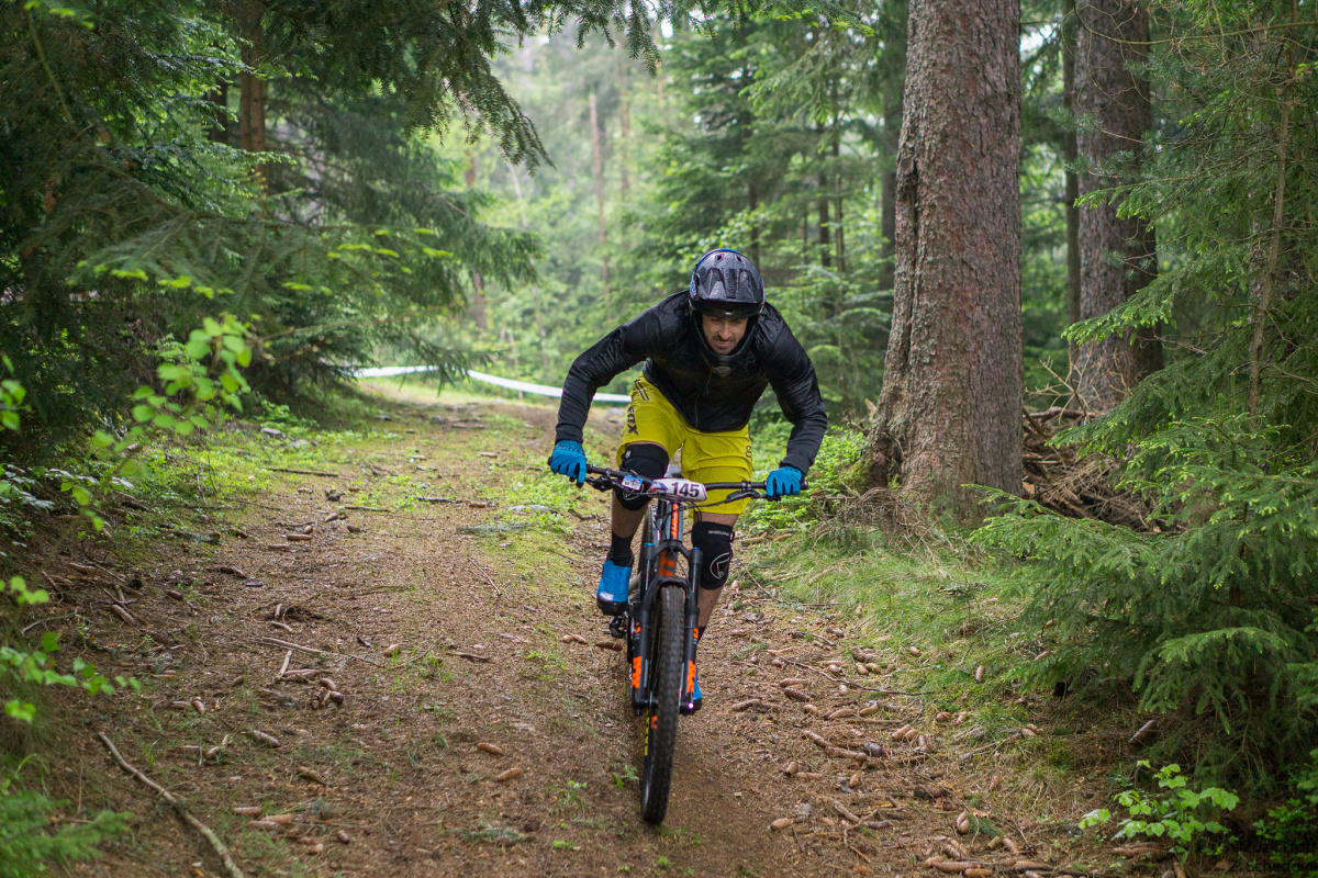 Taktéž včasné přeřazení před krátkým, ale zato prudkým silovým výšlapem nacházejícím se ve druhé třetině trati, které jsem si od okamžiku startu v duchu připomínal, mi vůbec nevychází a já to tam stejně jako před rokem táhnu na sílu skoro na nejtěžší převod. S jízdou nejsem vůbec spokojen, ale fun factor byl přesto hodně vysoko – technické a zároveň rychlé tratě já tuze rád. Jen to ježdění na oči mi moc nejde a taky nohám se dnes moc nechtělo.