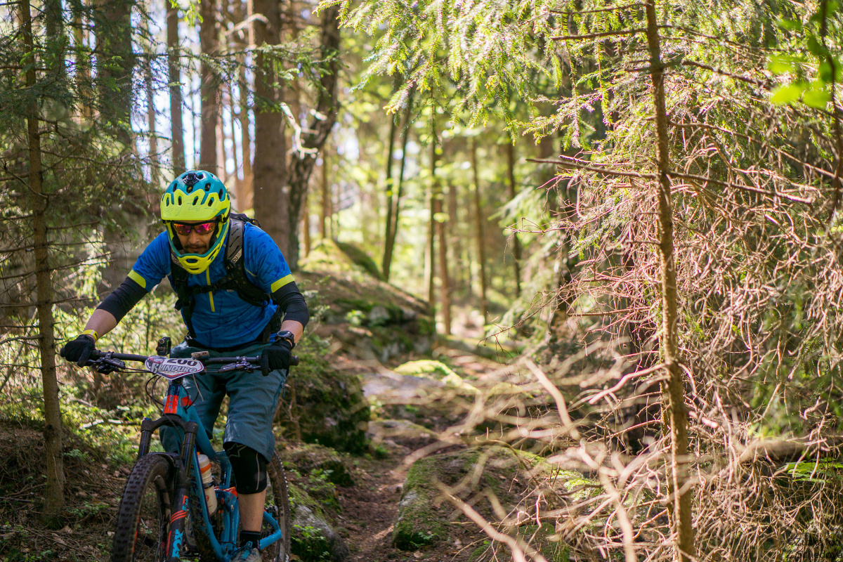 Transfer zpátky na hřeben ke startu RZ2, který se nacházel nedaleko jedničky, byl naveden z drtivé většiny po místních singláčích a nebyl příliš dlouhý ani náročný. Přesto jsem se v bundě cestou vzhůru docela zapotil. Snad to bude v neděli bez deště, toto navrstvení mě při šlapání úplně nebaví, a jelikož jedu bez batohu, tak nemám jednotlivé vrstvy ani kam odkládat.