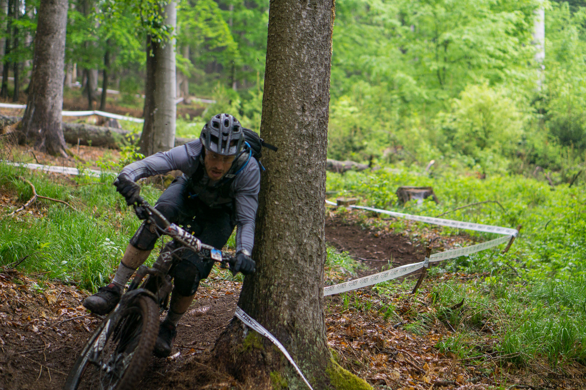 Ostré zatáčky střídají rychlejší rovné úseky a jistotu trakce na měkkém povrchu pravidelně narušují oslizlé kořeny a pařízky, které je třeba překonat. Na rychlé rovince přibližně v polovině trati už mám opět na dohled dvojici jezdců přede mnou. Motivován dojet je co nejrychleji do toho šlapu o to usilovněji a v plné rychlosti se vrhám přes další hluboké rochniště, ve kterém mi obě kola zmizí jako v bažině.