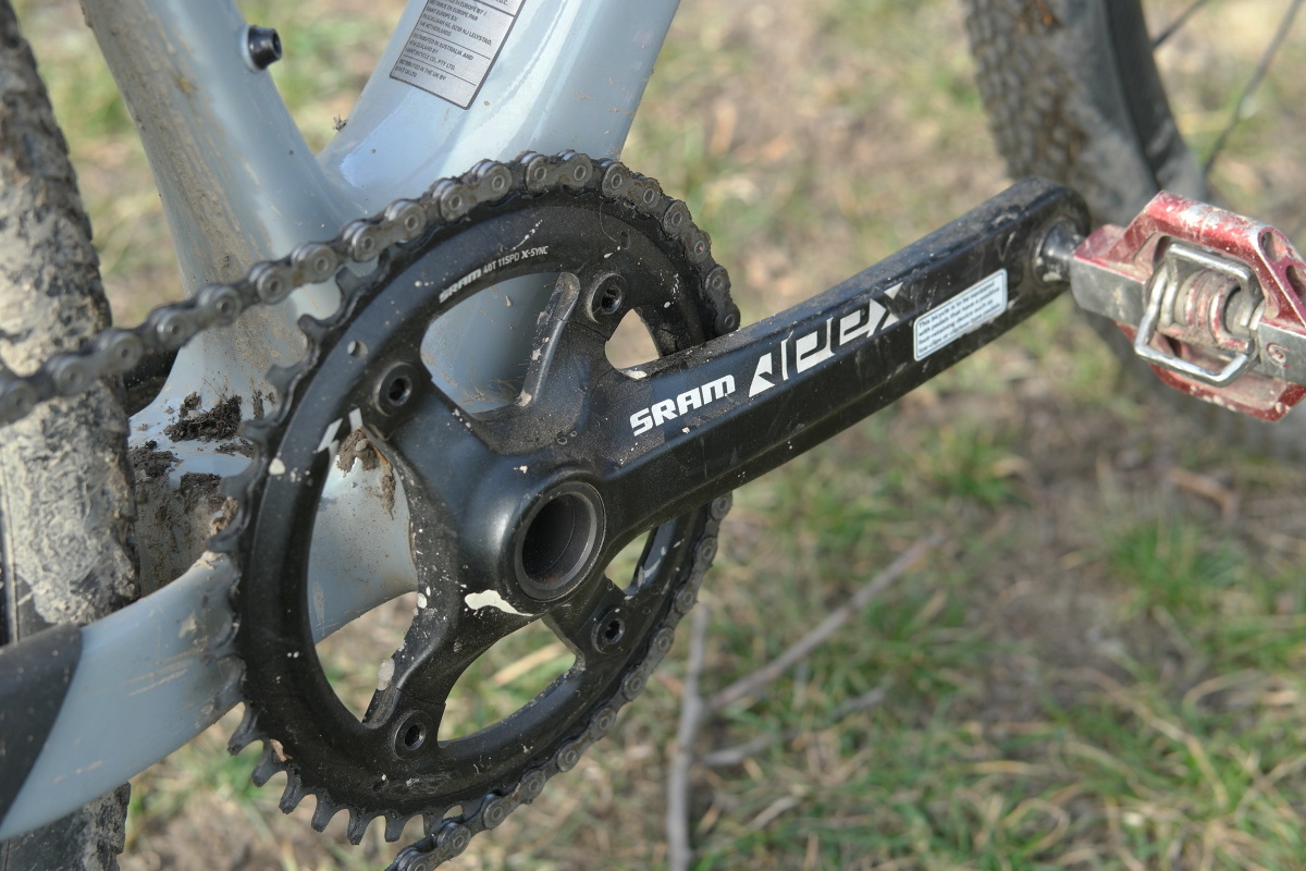 Nic proti Shimanu, na silnici je to pecka, ale SRAM s jedním převodníkem se mi na štěrkoletu líbí víc, už jen opticky, navíc mě jeho hrubý a zdánlivě neotesaný projev prostě baví. Člověk mu sice musí přijít na chuť, jakmile se tak stane, pak už jen těžko vede cesta zpět. Navíc o jednopřevodníku s větší kazetou (11-42 z. – zajímavé, jak se dosluhující systém z MTB dobře zabydlel u gravel biků) jsem se již nejednou vyjadřoval nanejvýš pochvalně.