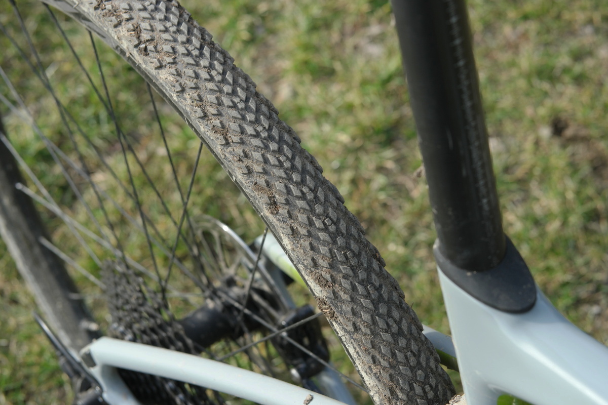 Jak asi víte, štěrkolety nejsou horská kola, proto na nich není až tolik samostatných hejblátek a udělátek, abych se nad nimi mohl obsáhle rozplývat, nebo naopak lamentovat. Vzhledem k tomu, že jsme si již prošli brzdy a řazení, není zde již moc dalšího na co se zaměřit. Snad už jen pláště z produkce samotného výrobce – Giant CrossCut Gravel 1 (700×40) – se zajímavým šípovitě orientovaným vzorkem.