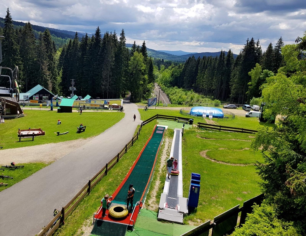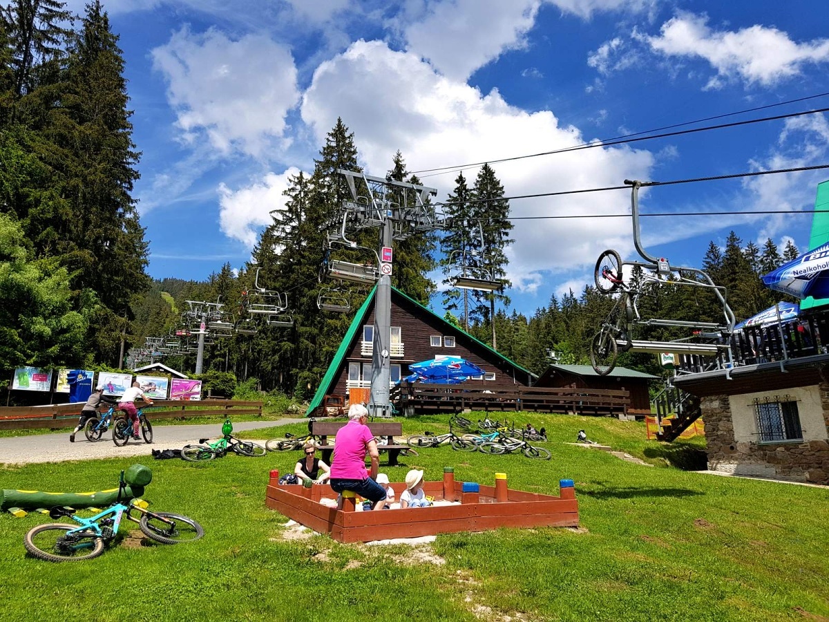 Přímo u lanovky najdete také velmi moderní půjčovnu kol a sportovní obchod s kvalitní bikerskou výbavou od rukavic přes brýle až po integrálky. Co je velká konkurenční výhoda oproti jiným bikeparkům, jsou kvalitní nové stroje k zapůjčení – vyzkoušet můžete například aktuální modely Kona Operator.