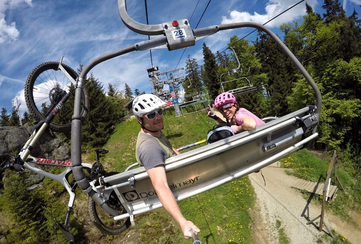 Na Špičáku jsme sedlali kola Ghost FR AMR 8.7 a Lapierre Overvolt Carbon AM 900 Team, byli jsme oblečeni v Maloje, s rukavicemi, chráničemi a helmami Poc a batůžkami Evoc. Videomateriál jsme pořídili technikou Lamax a Samsung.