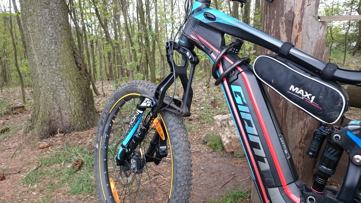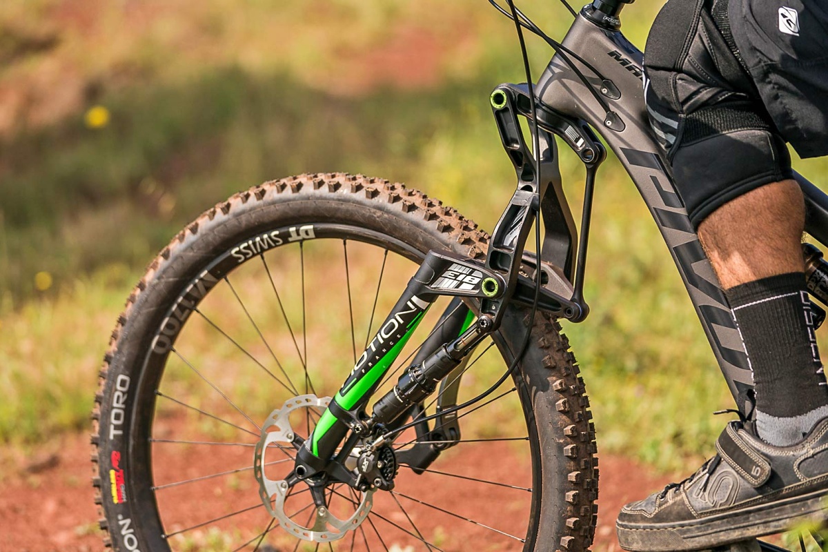 *Vidlice osazená na zobrazeném kole je ve verzi E-18 se zdvihem 170 mm a přestože výrobce u této varianty oficiálně udává maximální rozměr pneumatiky 27,5×2.5″, tak se sem reálně vešlo 27,5×2,6″ (Schwalbe Rocket Ron). Ale pochopitelně záleží na konkrétním plášti, ráfku atd. Jak uvádí majitel: „Byl to trochu risk, ale vyšlo to!“
