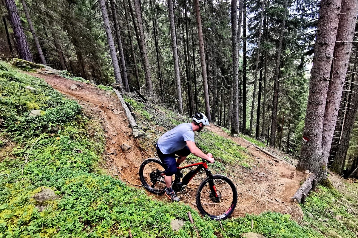 My začínáme rovnou na novém trailu ZweiZweier, který je dlouhý 3,5 km a stejně jako EinsEinser je značen ve smyslu střední obtížnosti. Ta v praxi znamená, že pokud sem vezmete začátečníka, tak vám úplně nepoděkuje, nicméně takový endurista vám bude líbat nohy.