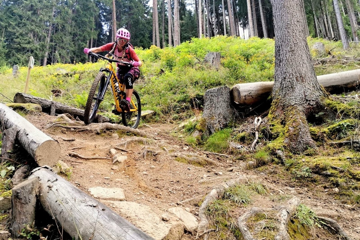 Elfer si zakládá na ryze přírodních trailech, takže tu nečekejte množství dvojáků, lavic nebo wallridů. Jediné „dřevo“ najdete skoro na konci trailu v podobě třech různě velkých dropů a jednoho krkolomného wallridu, na jehož vyzkoušení jsem ani nepomýšlela, protože mi připomínal dráhu v Motole. Dropík do ne zcela dokonale vyšejpovaného dopadu se ale dá zvládnout v pohodě 😉