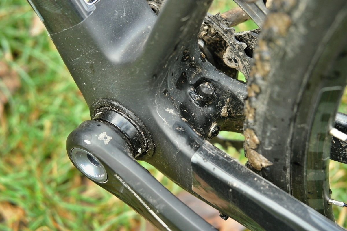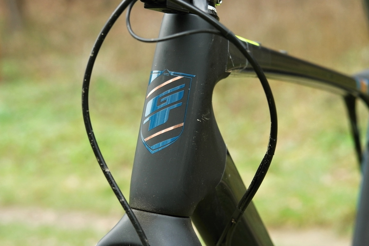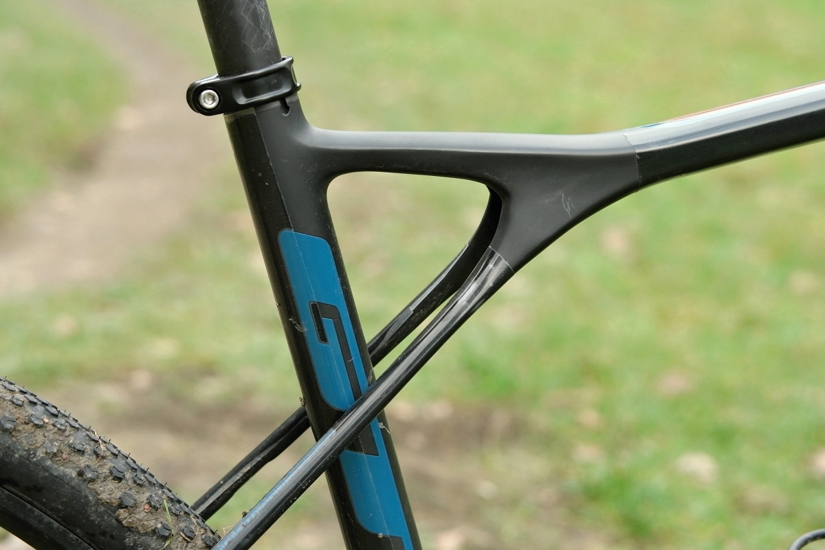 Opustíme-li téma ovládání, můžeme se zaměřit na jiné specifikum rámu GT Grade Carbon Pro a tím je konstrukce nazvaná Floating Seatstays, neboli plovoucí sedlové vzpěry. Jednoduše řečeno GT se rozhodlo, nejen u tohoto modelu, posunout koncepci tří trojúhelníků (Triple Triangle) ještě o kus dál tím, že odstranilo dříve používané pevné spojení sedlovky a horních vzpěr zadní stavby. Štíhlé vzpěry proto nyní sedlovou trubku pouze míjejí a napojují se až na horní trubku.