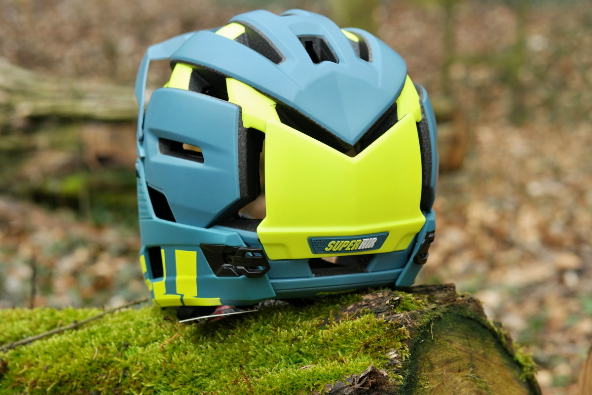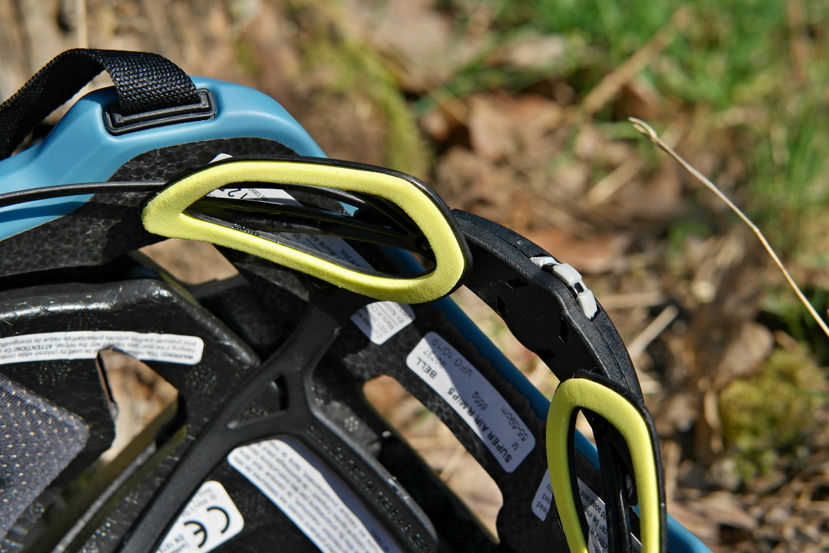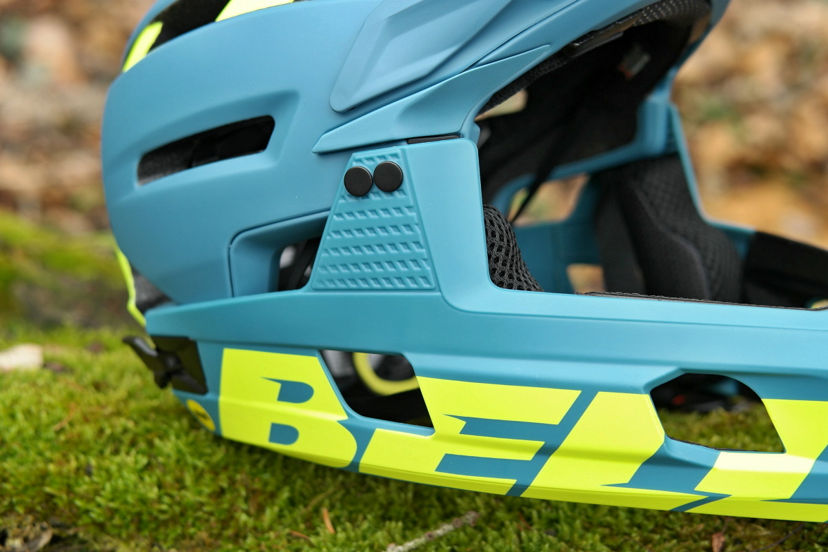 Jednou z novinek u modelu Bell Super Air R je také způsob uchycení chrániče brady, který již nevyužívá dvě boční přezky a jednu zadní, která vše sepne dohromady, ale pouze dva kovové háčky, které zapadnou od otvorů zhruba na úrovni spánků, a poté dvě přezky, jejichž zámky zapadají do otvorů vzadu na helmě.