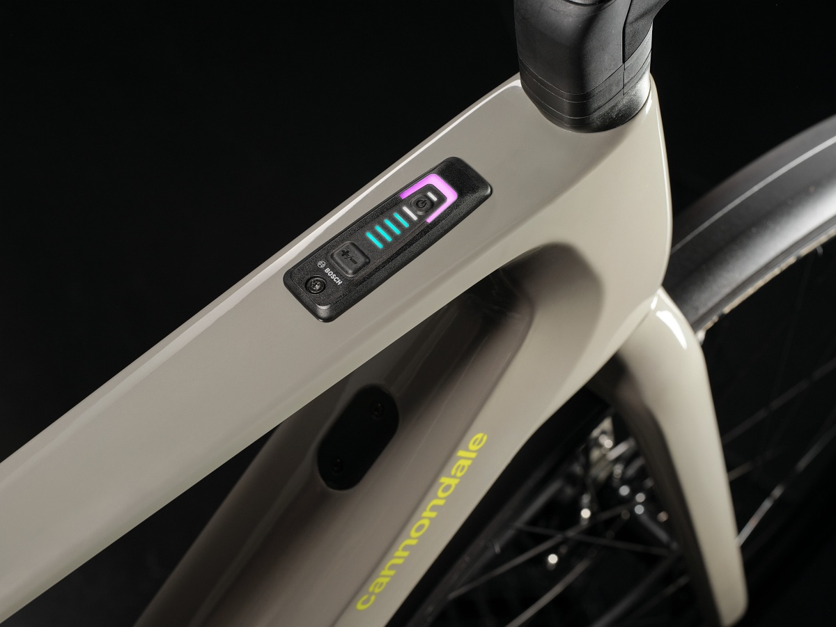 Novinka Cannondale Tesoro Neo Carbon působí elegantně při letmém pohledu z dálky, přičemž tento dojem se neztrácí ani při obhlídce zblízka. Nemalou zásluhu na tom mají integrované ovládací prvky pohonu, vnitřní vedení kabeláže, nebo třeba kompaktní a lehká baterie Bosch PowerTube 400 (400Wh). Perličkou může být nenápadná, přesto přehledá kontrolní jednotka pohonu na horní trubce kousek za hlavou.