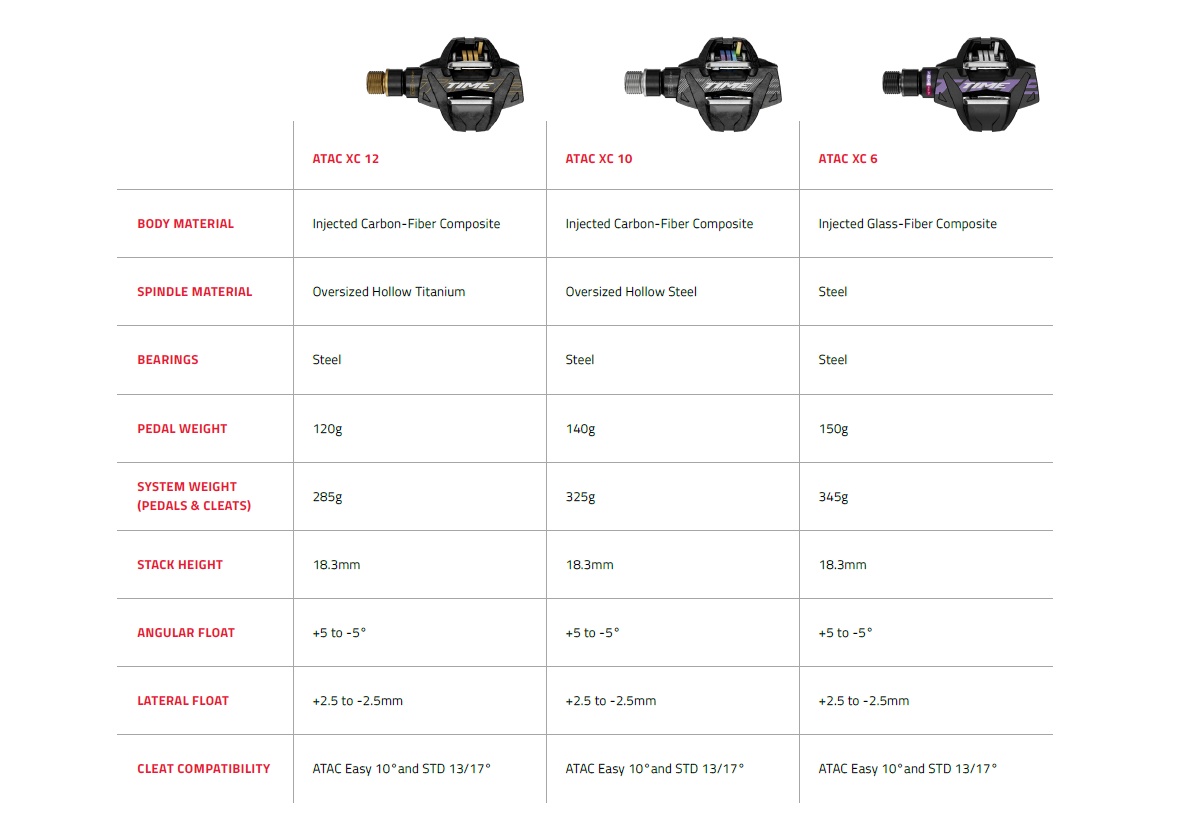 Z technického hlediska jistě stojí za pozornost, že dva nejvyšší modely TIME ATAC XC 12 a 10 využívají jako svůj základ tělo vyráběné vstřikováním uhlíkového kompozitu do formy, zatímco základní verze ATAC XC 6 jde cestou obdobné technologie, pouze uhlík mění za dostupnější skelná vlákna. Další rozdíly najdeme v podobě a materiálu osy, tedy velká dutá titanová (ATAC XC 12), dutá ocelová (ATAC XC 10) nebo základní ocelová (ATAC XC 6).