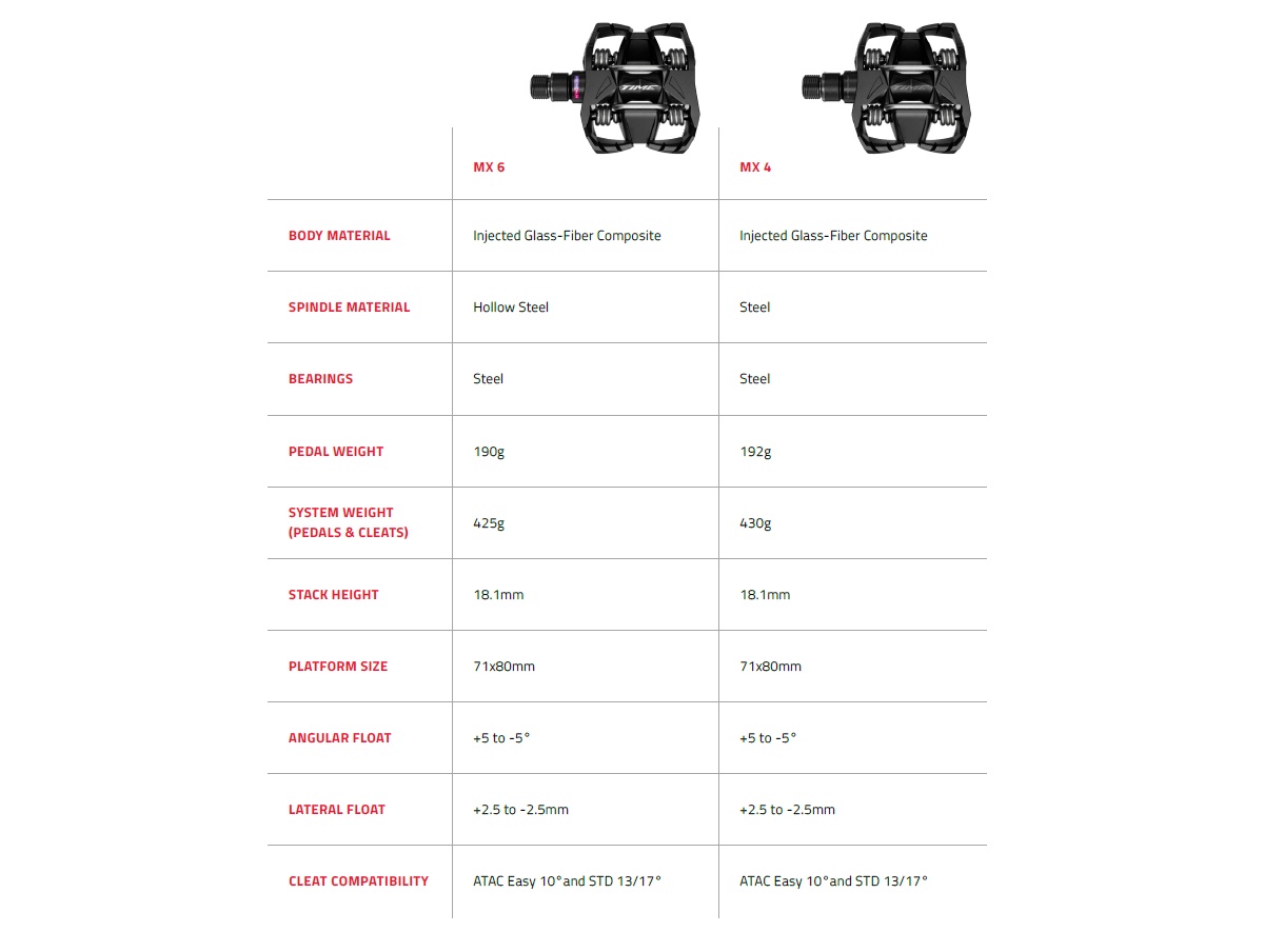 K dispozici jsou v této řadě dva modely, TIME MX 6 s dutou ocelovou osou a MX 4 s klasickou plnou osou z oceli. Rozdíl v hmotnosti je jen v řádu gramů, dutá osa bude jistě o něco tužší a odolnější. Nejen v tomto případě, ale i u ostatních MTB pedálů TIME lze volit dvě různé podoby „zarážek“ (kufrů), verze ATAC Easy 10° a Standard 13/17°. O nich bude ještě řeč.
