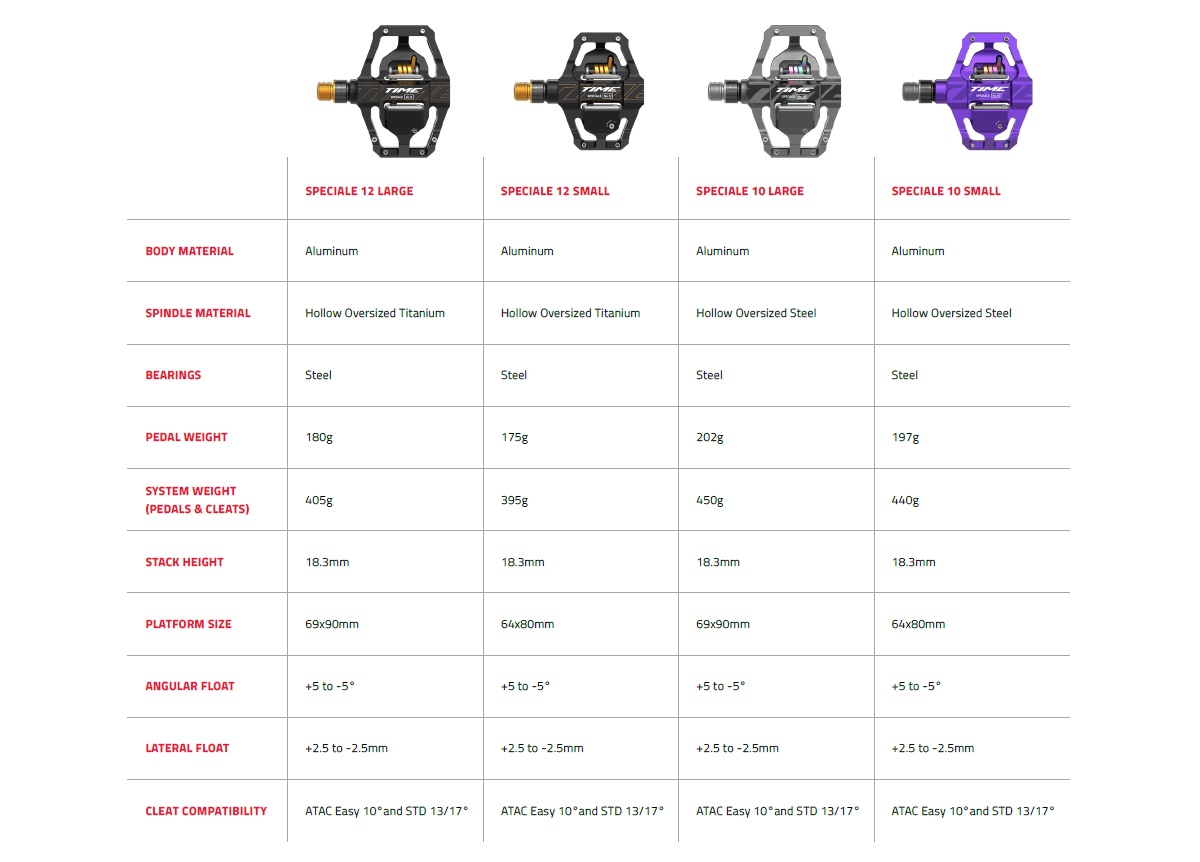 Konstrukčně tyto pedály nabízí zmíněné dvě velikosti opěrné hliníkové platformy (Large / Small), vytříbený upínací mechanizmus TIME ATAC s možností detailního nastavení upínací síly (micrometric) a dvě materiálové, či cenové úrovně. Vrcholné Speciale 12 s oversize dutou titanovou osou a Speciale 10 s rovněž velkou dutou, ale ocelovou osou. Rozdíly v hmotnosti najdete v tabulce.