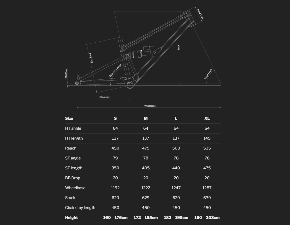 Pokud to chcete vyjádřit čísly, tak zmíněné Mko (reálně Lko) disponuje rozvorem 1247 mm, nabízí hodnotu dosahu (reach) ohromných 500 mm, délku zadní stavby „normovaných“ 450 mm a než si řekneme něco o úhlech, tak bych zmínil ještě délku hlavy 137 mm (nezvykle shodná pro vel. S, M a L). Samotné základní úhly nikterak radikálně nepůsobí, neb se v tabulce dočteme o sklonu hlavy 64° a úhlu sedlové trubky 78°.