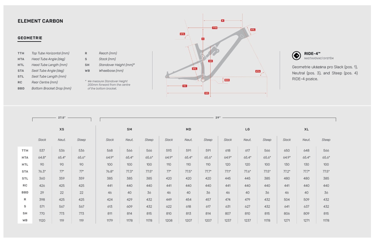 U nejnovějšího Elementu lze díky systému RIDE-4 měnit úhel hlavy v rozmezí 64,9° (Slack), 65,4° (Neutral) a 65,6° (Steep).