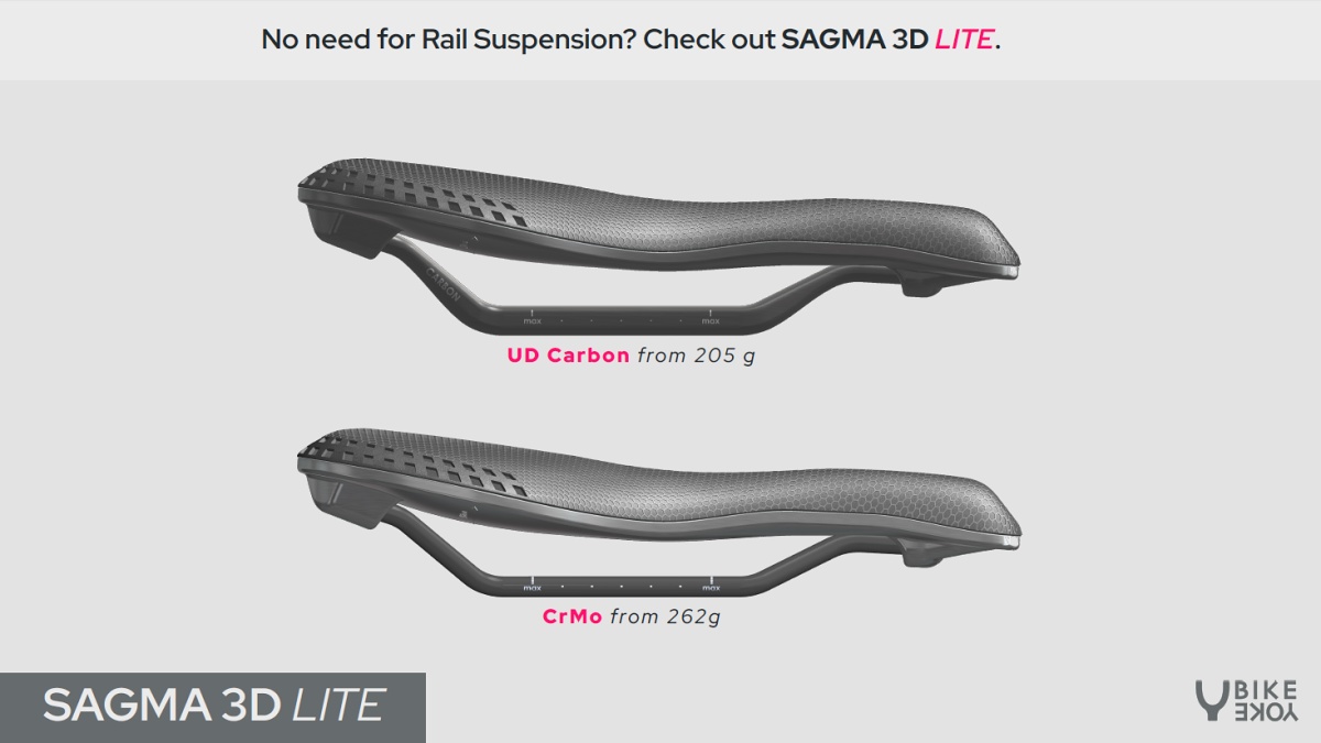 - BikeYoke Sagma 3D Lite – Cenově dostupnější a konstrukčně jednodušší verze s kompozitní skořepinou a CrMo, případně karbonovými ližinami. Díky absenci systému RSD jsou tato sedla ještě lehčí (205 g / 260 g – karbon/CrMo ližiny | *Sagma 3D Lite 130). Nenabízí sice možnost volby tuhosti a volnosti pohybu, přináší ale přímočarou konstrukci a přednosti 3D tisku.