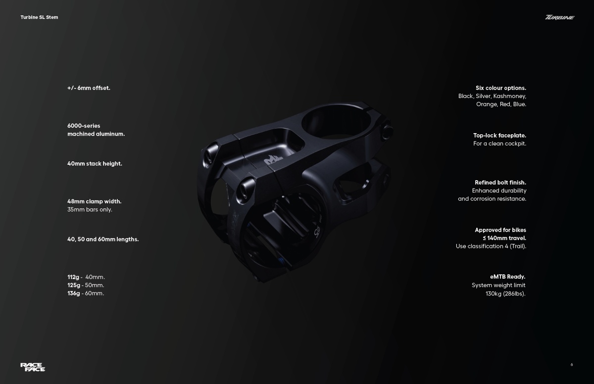 Turbine SL nabízí rozumnou fyzickou výšku představce (stack height – 40 mm) a šířku upnutí 48 mm. Tato řada představců je určena (schválena) pro kola s maximálním zdvihem 140 mm (třída 4 – Trail). Její konstrukce je počítána pro maximální systémový váhový limit 130 kg, nic tedy nebrání využití i v případě lehčích sportovních eBiků.