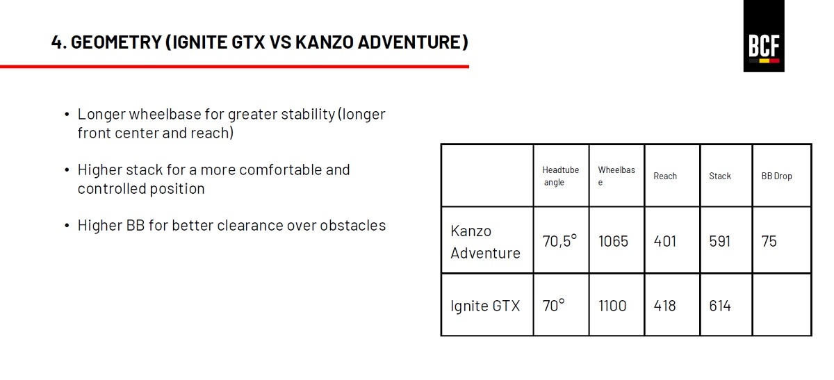 Geometrie tohoto nového „alpského gravel biku“ vychází z dobře známého XC hardtailu Ridley Ignite SLX. Nabízí tedy výraznou bikovou siluetu s více položeným hlavovým úhlem pro větší stabilitu (Ignite SLX – 70° / Ignite GTX – 70° / Kanzo Adventure – 70,5°). Vývojáři navíc přidali prohnuté vzpěry zadní stavby pro vyšší komfort. Jako bonus lze vnímat prostor pro náležitě široké pláště s ostrým vzorkem do rozměru 29×2,3“.