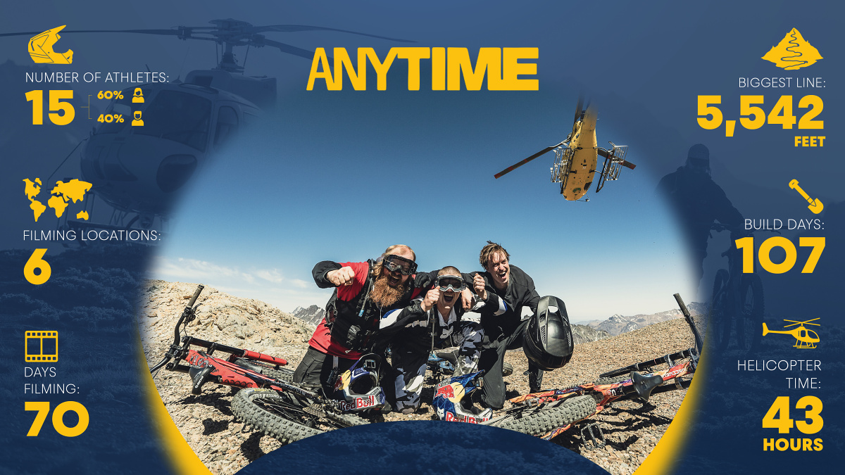 Snímek Anytime měl premiéru loni v září na platformě Red Bull TV. Při cestách napříč skoro celou planetou sleduje 15 výjimečných jezdců, kteří se snaží stále dokola posouvat hranice možného.