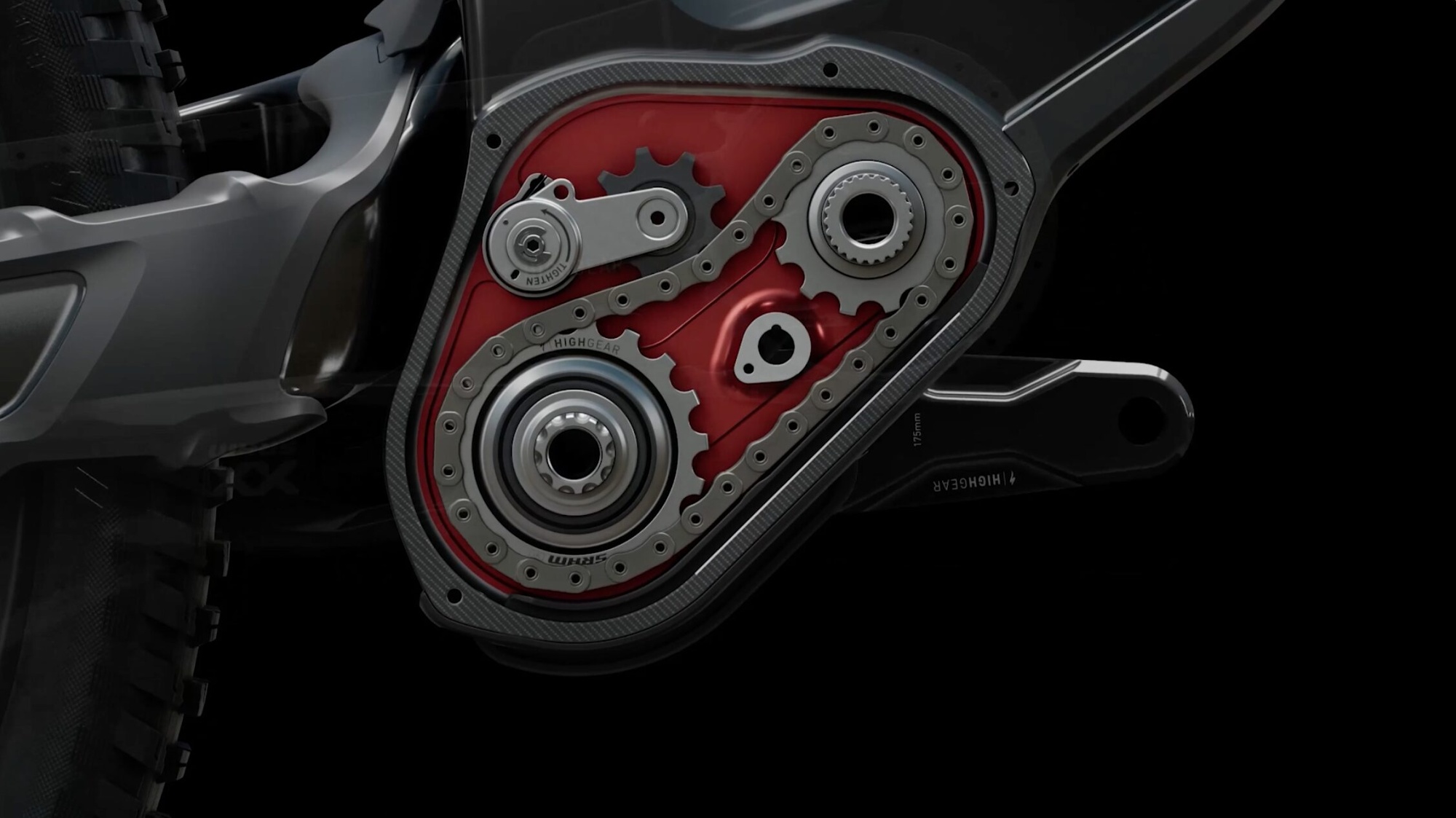 Nyní to neméně důležité. S konstrukcí OBB a s vyšší pozicí hlavního čepu úzce souvisí i potřeba upravit výšku řetězové linky. Řada konkurentů toto dnes běžně řeší přídavnou kladkou, posazenou do úrovně hlavního čepu. Specialized na to jde ale jinak. Systém HighGear je vlastně „mini převodovka“, která odděluje primární a sekundární převod, navíc v tomto provedení vizuálně odděluje též kliky od pohonu spojujícího rám a zadní kolo.
