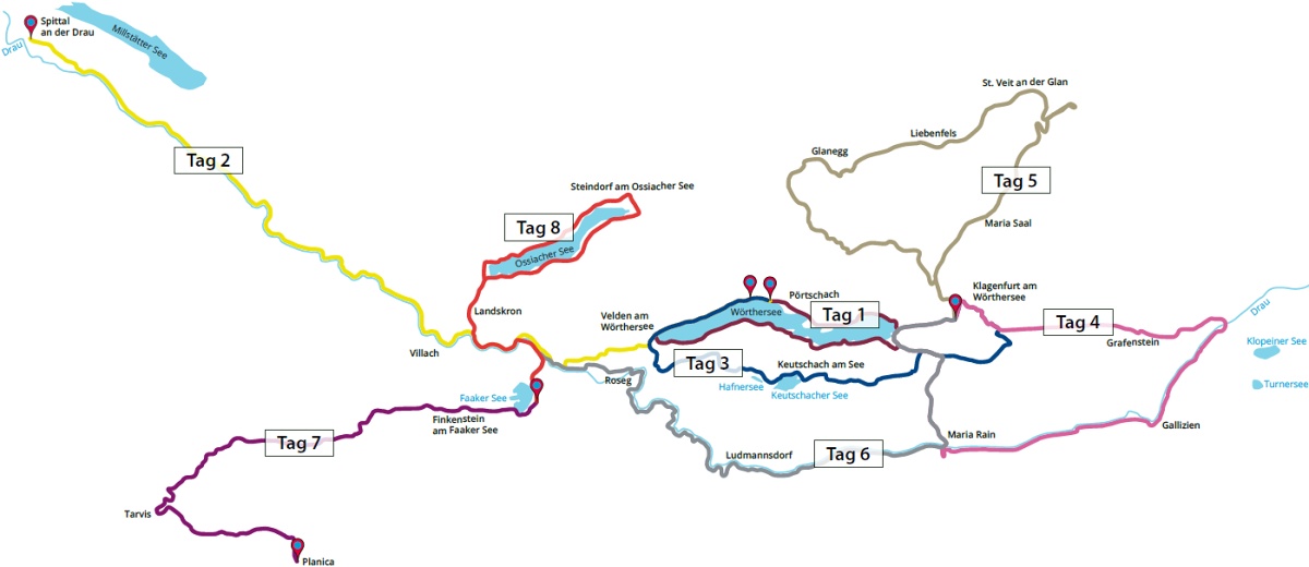 Po kvalitně vybudovaných cyklostezkách a uzavřených silnicích se projíždí půvabnými městečky jako jsou Velden, Villach, Spittal an der Drau a také korutanskou metropolí Klagenfurtem. Kromě Wörthersee poznáte také další idylické údolí s menšími jezery.
